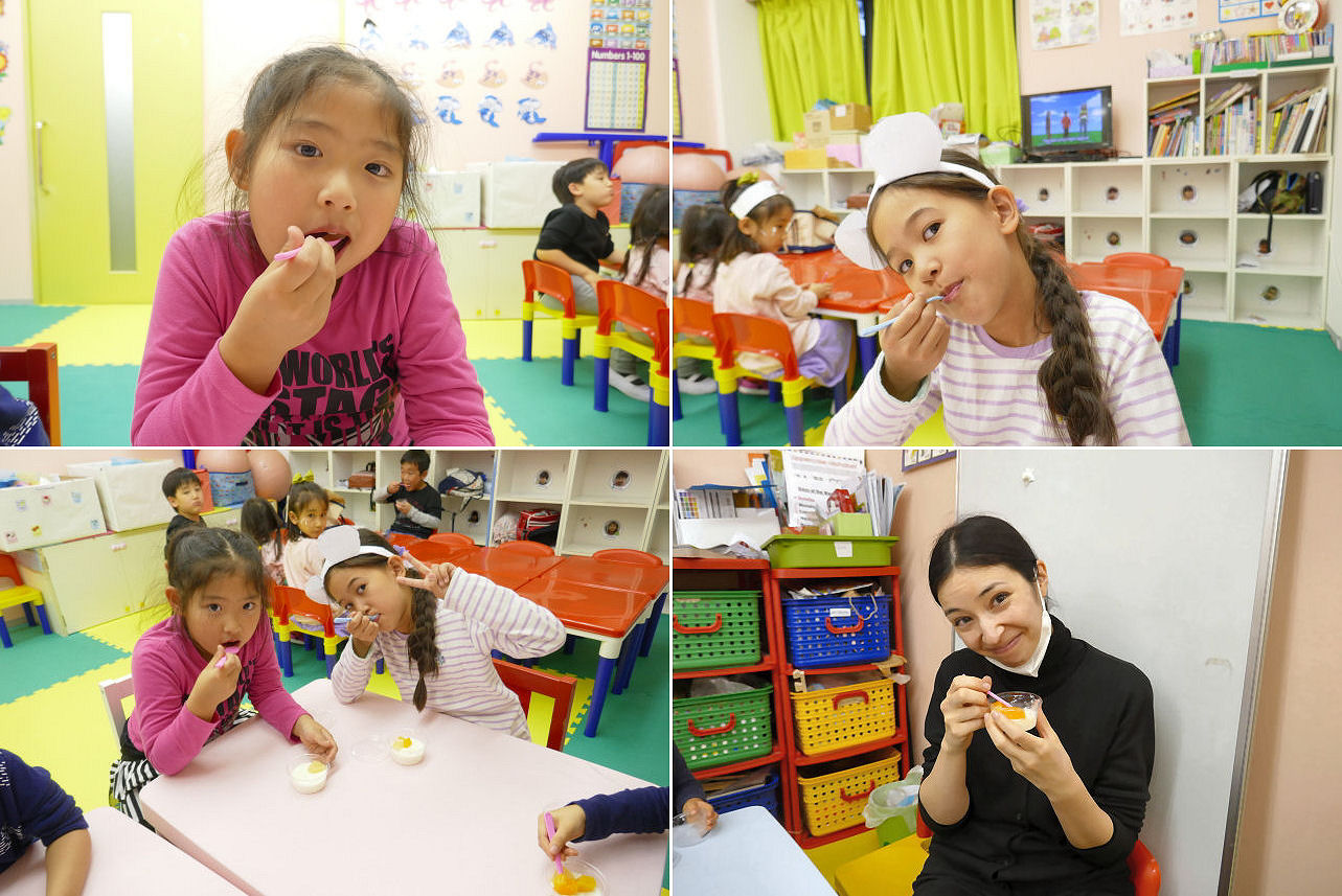 今日は そんな日。オヤツ休憩の時間にスタッフから ちょっぴり贅沢な お手製のデザートの差し入れが ありました。作ったのは おフランス料理店でアルバイト経験のあるスタッフ。本来ならデザート作り実習という形にしたいところでしたが、アフタークラスでは その時間を確保できないのでスタッフが作り、完成形をキッズに配付。オヤツ休憩時はアフタースクール(英語環境の学童保育)および夕方まで滞在しているフルデイキッズと一緒です。