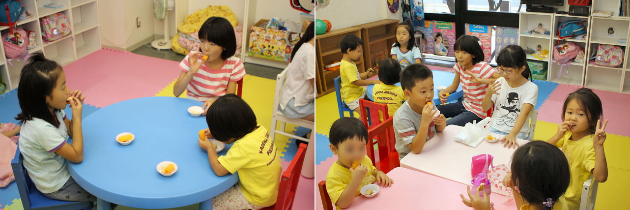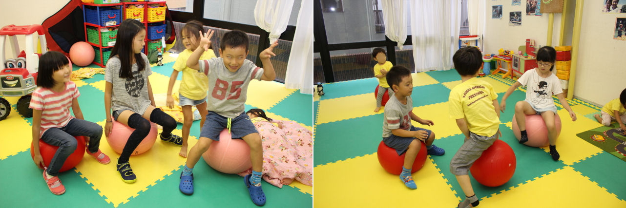 また、この時間帯は夜までフルデイクラス、というキッズも滞在しています。そのため、幼いキッズ達の面倒を見たり、一緒に遊んだりして良きお兄ちゃん・お姉ちゃんぶりを発揮する機会にもなります。黄色いTシャツを着ているのがフルデイクラスのキッズです。(この日、フルデイクラスは遠足が あったため、たまたまスクールTシャツを着ていますが、普段は私服で登園します)