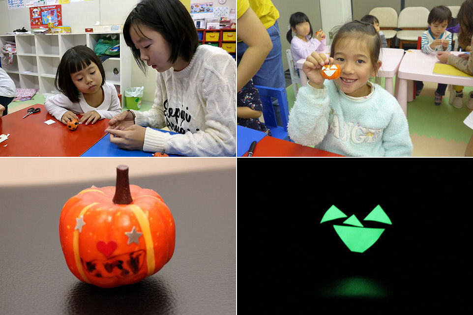 まずは小さなお化けカボチャ作り。既製品のオモチャカボチャにシールを貼り付ける、又はペンで模様をつける作業ですが、夫々に個性が全開となる瞬間です。大人の固定概念では くくりきれない発想が多数出てきて、どれもスタッフ達を唸らせる作品となりました。但し、今回はカボチャの前面のみを使って創作するように指示。