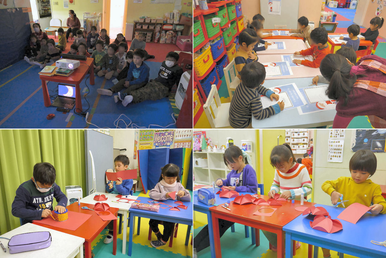 午前のオヤツの時間はDVD鑑賞会を実施。前半は いつものように子供向けの科学番組。今回のテーマは寒い日にちなんで(?)日食でした。後半は とある親御さんが提供してくれた海外の短編アニメ番組。サンダーバードのような国際レスキュー隊(?)の話でした。みんな、ちゃんと理解していたかな? 鑑賞会の後はクリスマスにちなんだ工作やら、サンタさんに おねだりの手紙を書いたり。