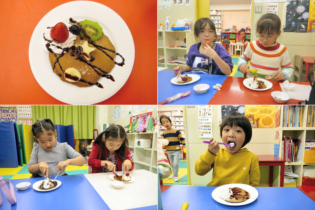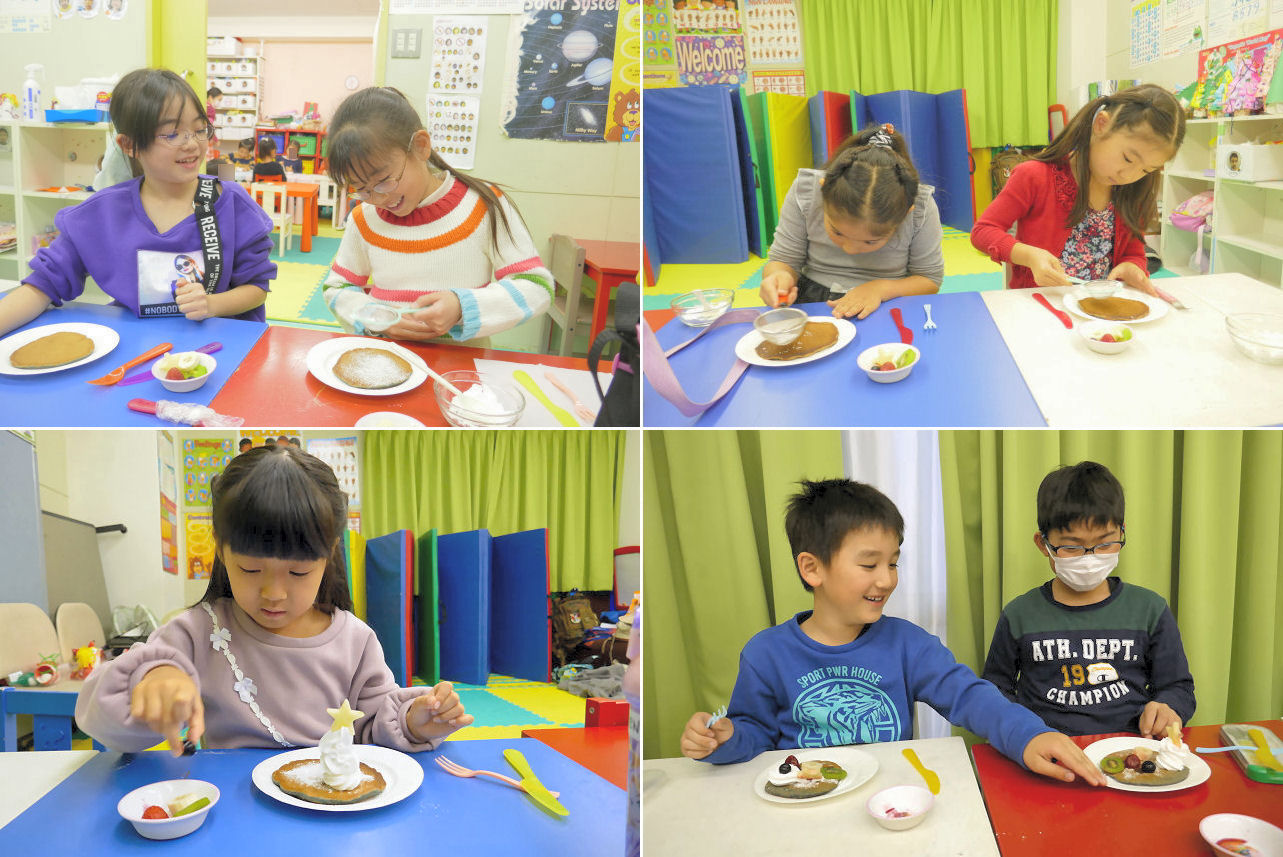 昼食後は お待ちかねのデザート作り実習。指導するのは学生時代に おフランス料理店でアルバイト経験のあるスタッフ。今回のテーマは野菜パンケーキ。とはいえ現場で焼く時間が無いので、パンケーキその物はスタッフが事前に準備。牛乳の代わりに紫の野菜ジュースを使って作っています。そこにキッズが色々と飾り付けをしていきます。
