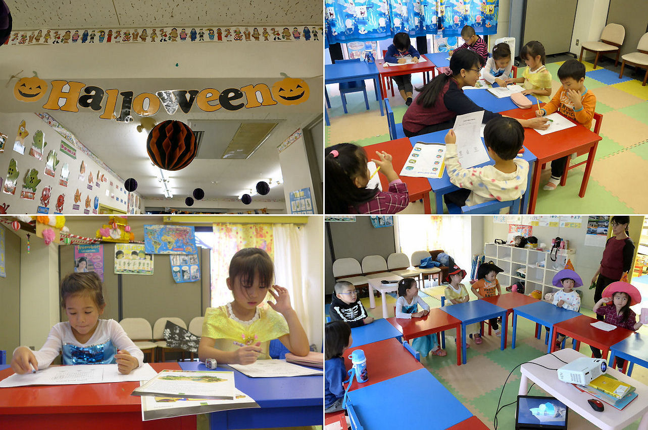 もうすぐハロウィーン。スクールの中はハロウィーンの雰囲気がギッシリ。フルデイクラス(平日の日中)と比較すると簡略版になりますが、この日はサタデークラスでハロウィーン企画を先行実施。希望者は仮装して登園し、そのまま授業を受けたため、教室内は妙な光景でした。