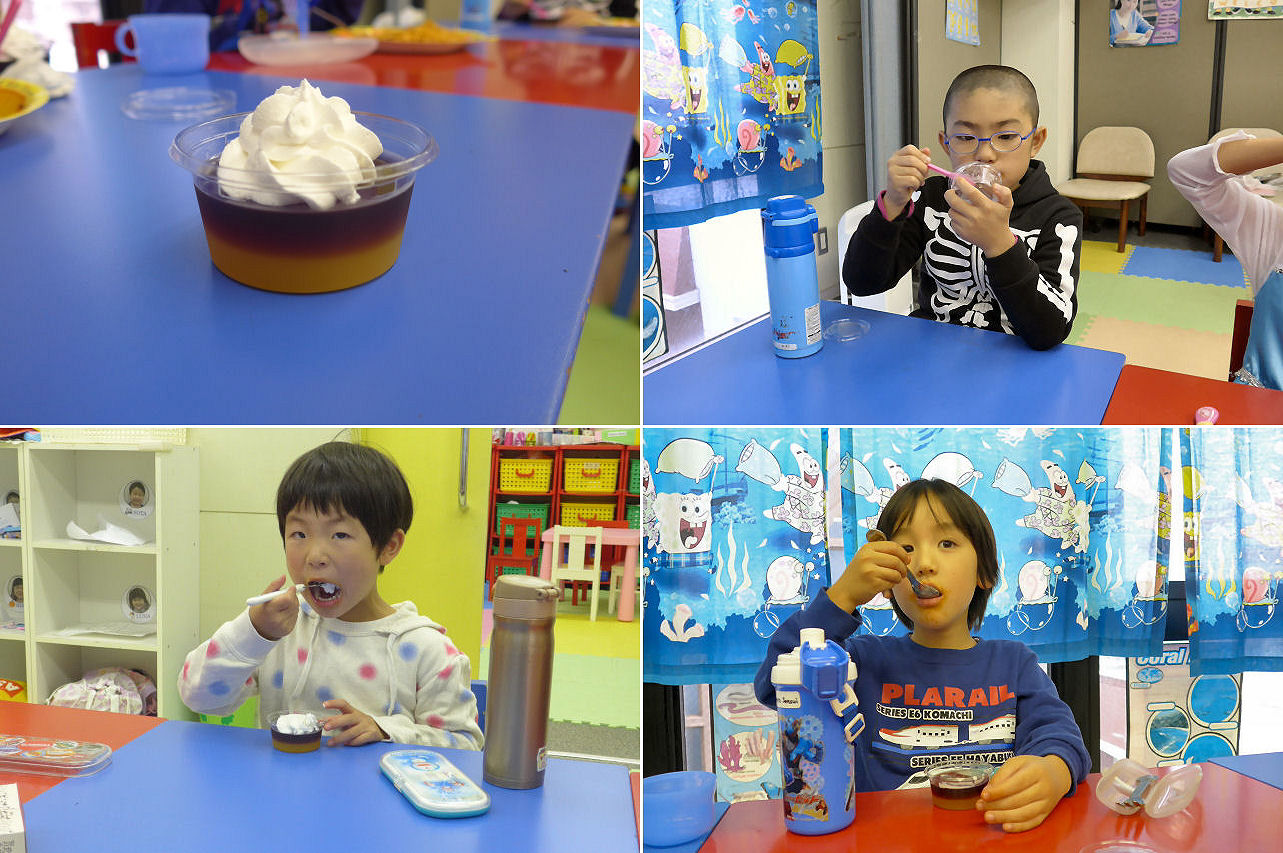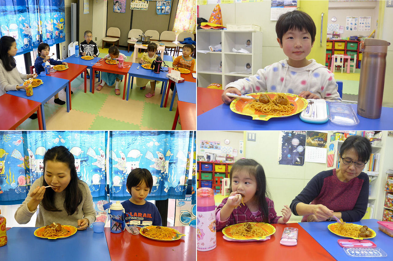 今日はハロウィーン名目でランチパーティーを実施。ここ数か月、サタデークラスでは色々と新しい試みを導入していますが、意外にもランチパーティーは これが今年度最初の実施となりました。ディズニー映画「わんわん物語」に登場したスパゲティーのミートボール乗せ。待ちきれないキッズ続出のため、早速いただきます。