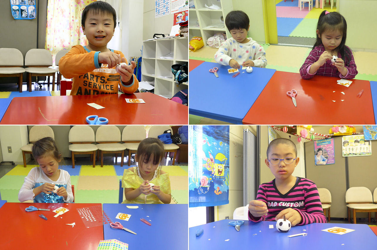 いつもより早く昼食を終え、工作教室名目で小さなお化けカボチャ作りを実施しました。趣向を変えてカボチャの色は白。前面は通常のシールで顔を作り、後面は蓄光テープで顔を作り。夜は不気味に目と口が光るので、冷房いらずになりそうです!?
