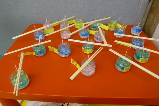 本日のサタデークラス、まずはロウソク作り実習から始まりました。スタッフによる概要説明の後、早速取り掛かります。砂を適量入れて、貝を入れて、アクセサリーを入れて。液体ロウはアツアツなので、スタッフが代わりに注入。