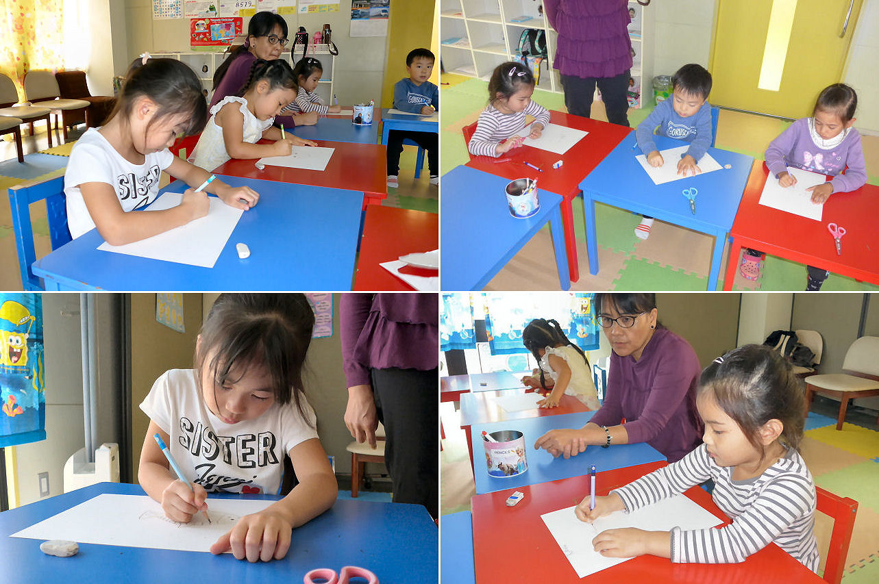 午前の授業中とは打って変わり(!?)、キッズの目は真剣その物で輝いていました。普段の授業の際も こうあってほしいものですが・・・。楽しい作業を英語を交えて実施することにより、自然に・楽しく英語を身に付けてもらうのが工作実習の目的。ですので、スタッフの目論見は大当たりと言えそうです。