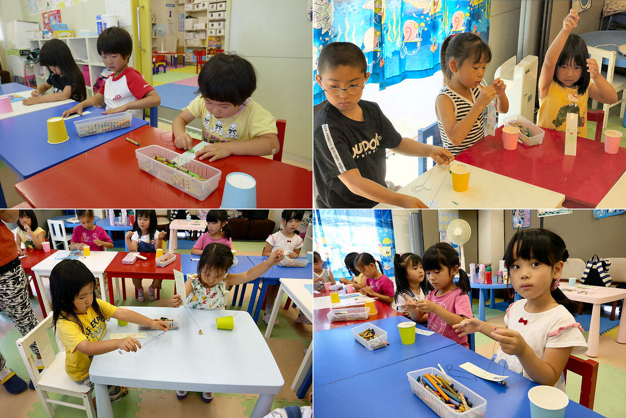 まずは午前中に工作教室。季節感たっぷりに風鈴作りに挑戦。暑い日が続く中で涼しい音色を奏でてくれます。あ、勿論、工作作業中も使われる言語は英語のみです。