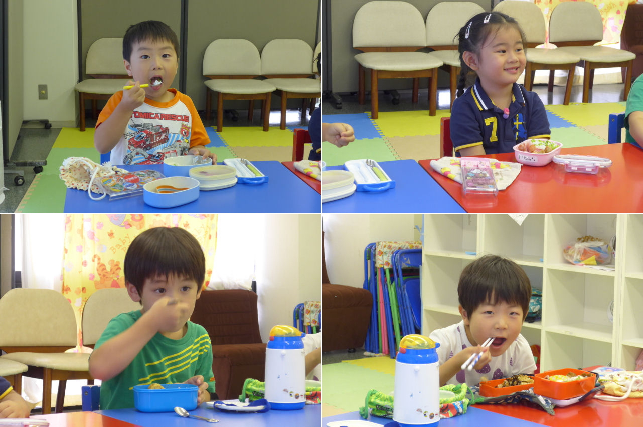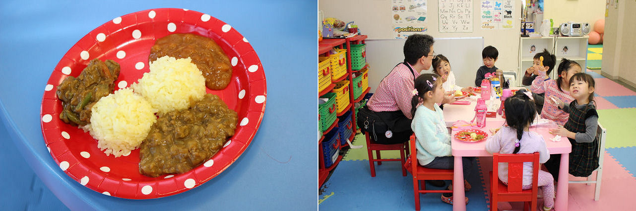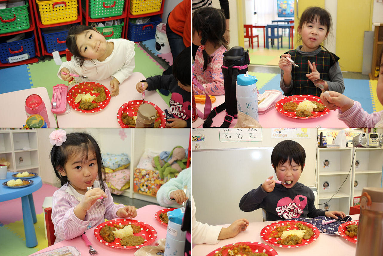 今日からサタデークラスに正式入園したキッズも勿論参加。普段、家で食べ慣れている日本風のカレーライスとは何やら雰囲気が違い、初めのうちは警戒(?)していたようですが・・・いつの間にか本能の赴くままにカレーを口に運ぶようになっていました。