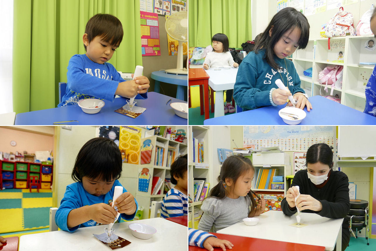 今日はパフェ作りに挑戦!・・・とは言っても食べる用の、ではなく、小型の模型です。まずはパフェ容器にホイップクリーム・・・を模した糊を盛りつけます。難しく感じるキッズに対してはスタッフが お手伝い。