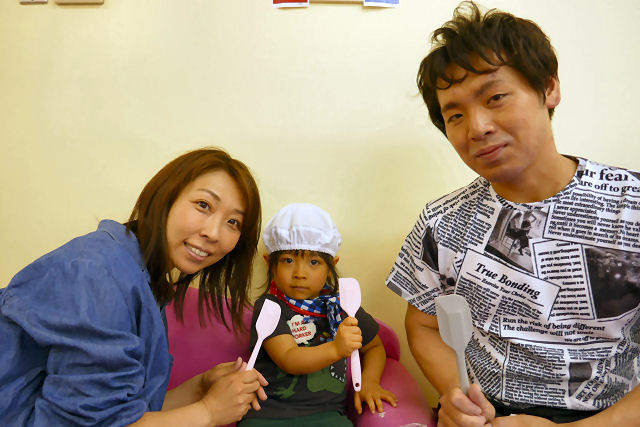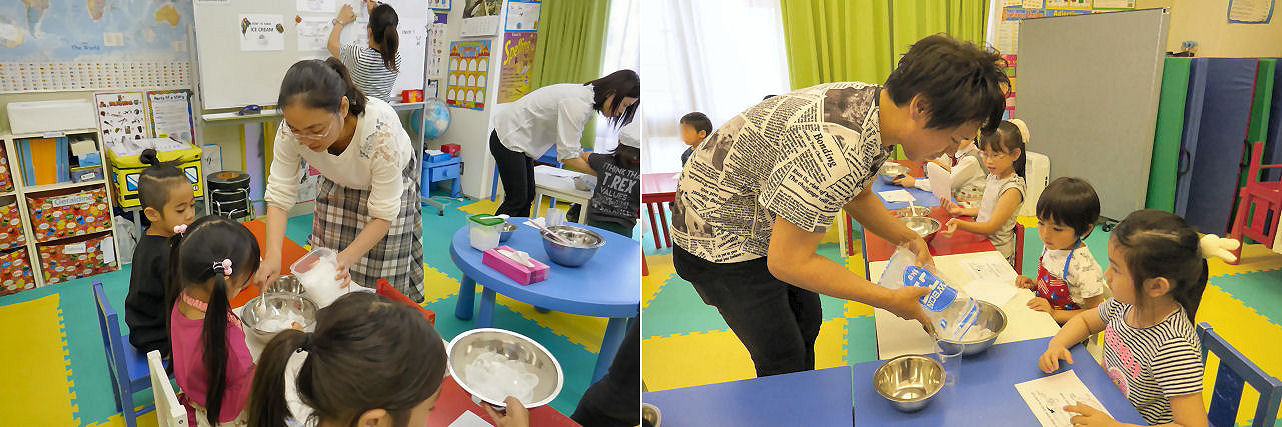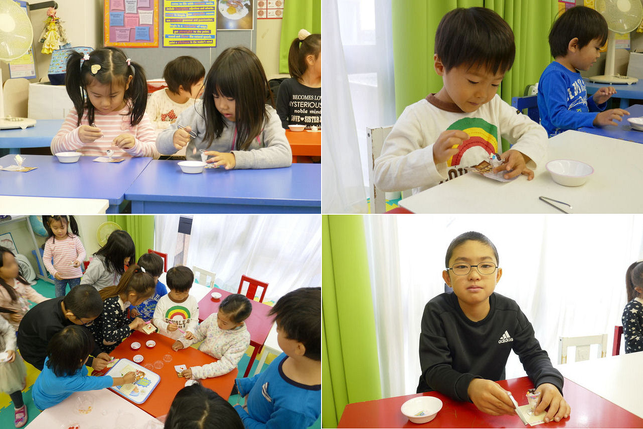 そこに好みのトッピングを加えていきます。トッピングは沢山の種類を用意し、その中から好きな物を選んだため、当然 仕上がりは三者三様です。また、粉のような小さなトッピングは中央の机で壮絶な争奪戦(?)が繰り広げられました。