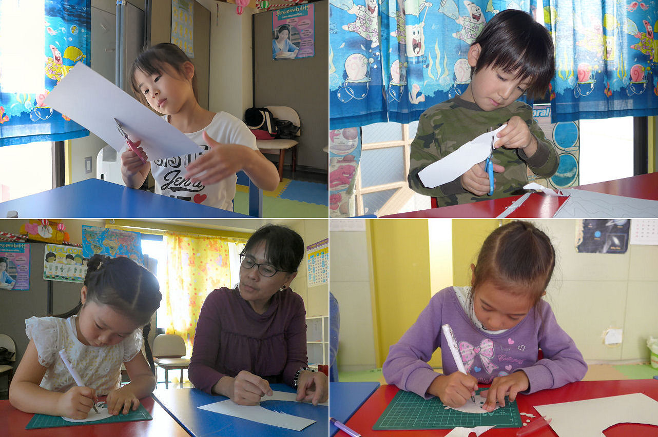 午前の授業中とは打って変わり(!?)、キッズの目は真剣その物で輝いていました。普段の授業の際も こうあってほしいものですが・・・。楽しい作業を英語を交えて実施することにより、自然に・楽しく英語を身に付けてもらうのが工作実習の目的。ですので、スタッフの目論見は大当たりと言えそうです。