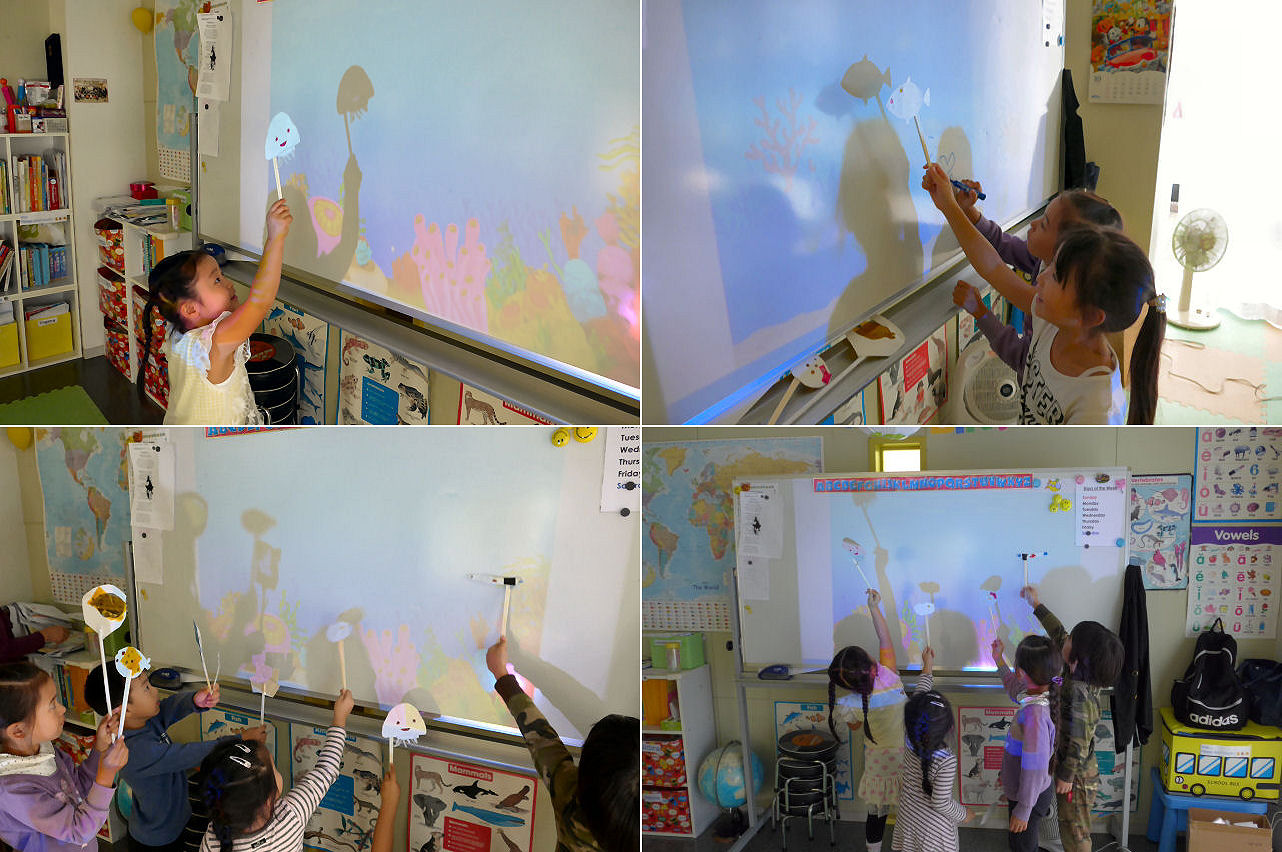 そうして出来上がったのは・・・一見、何の変哲も無い海の生物。ですが今日は作って終わりではなく、ここから続きがあります。プロジェクターで海中の映像を投影し、そこにキッズが作った海中生物を重ねると・・・影絵の完成。スクールの中が一瞬にして海底に早変わりしました。