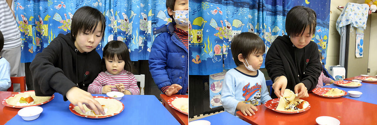あいにく、この日は体調を崩して お休みしてしまうキッズが多かったのですが(皆さんも体調管理を怠りなく!)、参加したキッズは思い思いにクレープ作りを楽しんでいました。ホイップクリームを乗せ、選んだ果物を乗せ、お好みのソースをかけて 折り畳みます。
