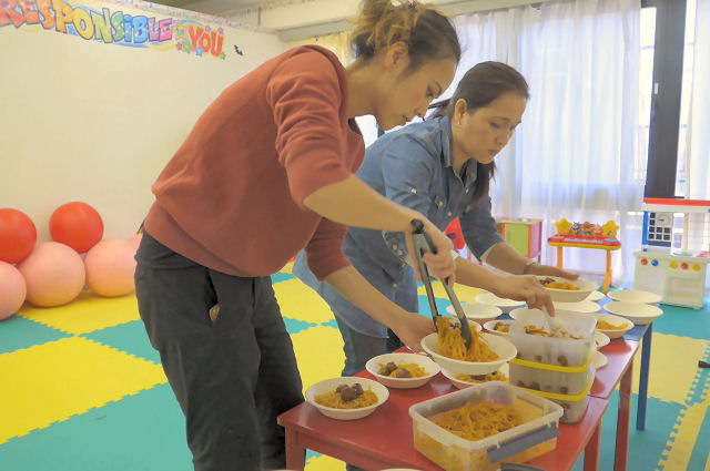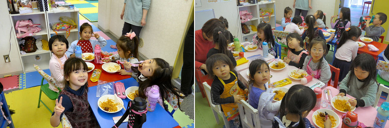 そして いよいよ昼食の時間。通ってくれるキッズが増えたのに加え、この日は春休み期間ということで普段はサタデークラスに来ているキッズもチラホラだったり、丁度 体験入園に来ている子もいたり。準備するスタッフも なかなか大変です。