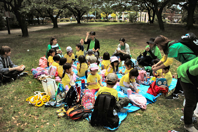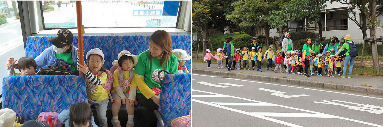 遠足を実施する度に参加するキッズの数が着実に増え続けており。また、今年に入ってから加わったスタッフ達にとっては遠足デビュー戦となります。目的地まではバスで移動しますが、中は英語だけが飛び交う治外法権状態でした。バスから降りた後は みんなで歩いて目的地に向かいますが・・・ハタから見たら ちょったした民族大移動ですね。