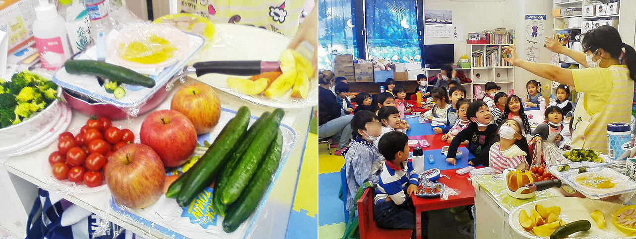 今日は雛祭り前日。例年ですとスタッフが雛祭り3色ゼリーを用意していましたが、今年は規模を拡大し、雛祭りに ちなんだ調理実習とランチパーティーを企画。ということで今日のキッズ、お弁当は米飯のみ持参して登園。様々な食材は昨日、キッズが買い物に行った際の戦利品。これから何を、どのように作るかを説明し、早速みんなで取りかかります。