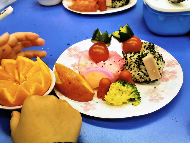 みんなが持参した米飯はお内裏様とお雛様に見立てたオニギリに形を変えていきます。みんな、うまく形作っているかな?