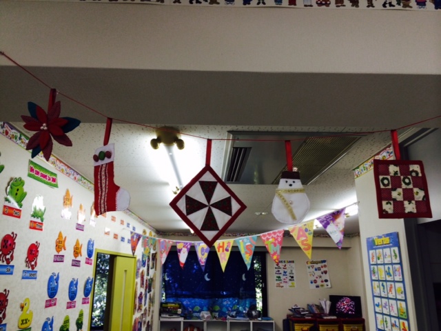 この、キルトで作られたクリスマスのオーナメントは、生徒さんのおばあちゃまの手作りです。