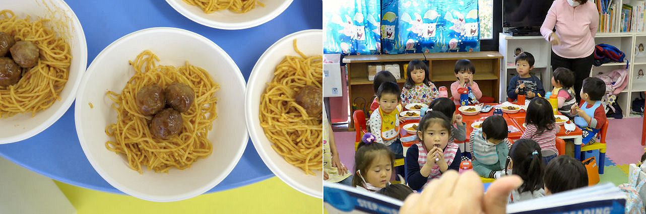本日の献立はスパゲティーのミートボール乗せ。担当するのは学生時代に伊太利亜料理店で勤務経験のあるスタッフ。配膳が終わり、さあ、いただきます・・・の前に絵本わんわん物語の朗読が始まりました。このタイミングで何故? 不平を漏らすキッズも いました。しかし! とある場面でキッズの目の色が変わりました。絵本に登場したのと同じ料理が今、まさに目の前にある! キッズは一気にトップギア。