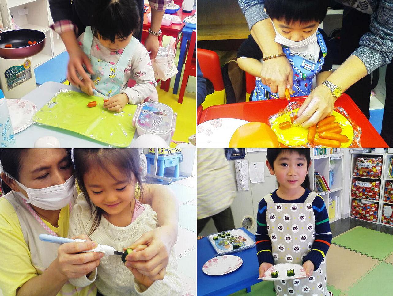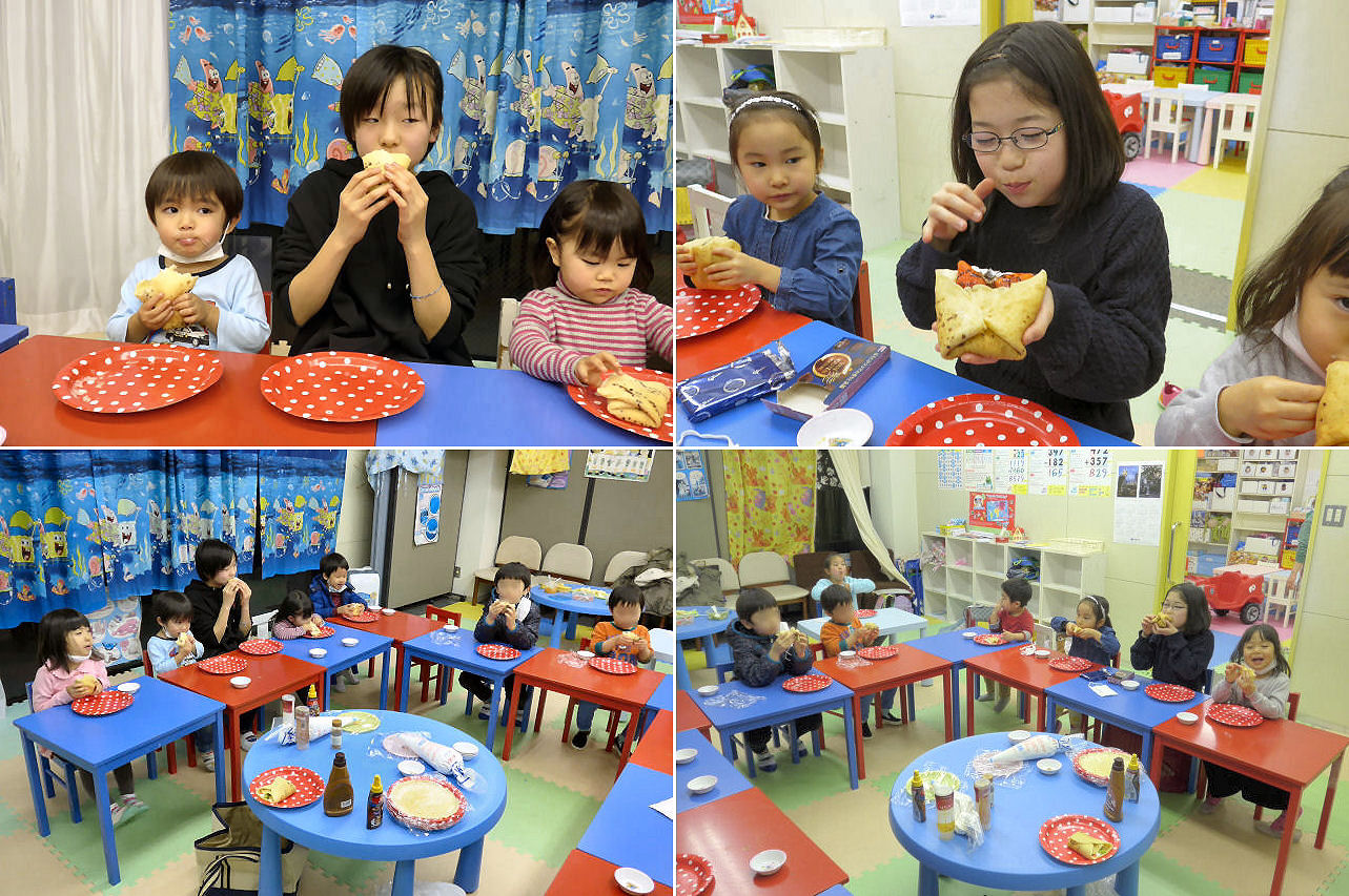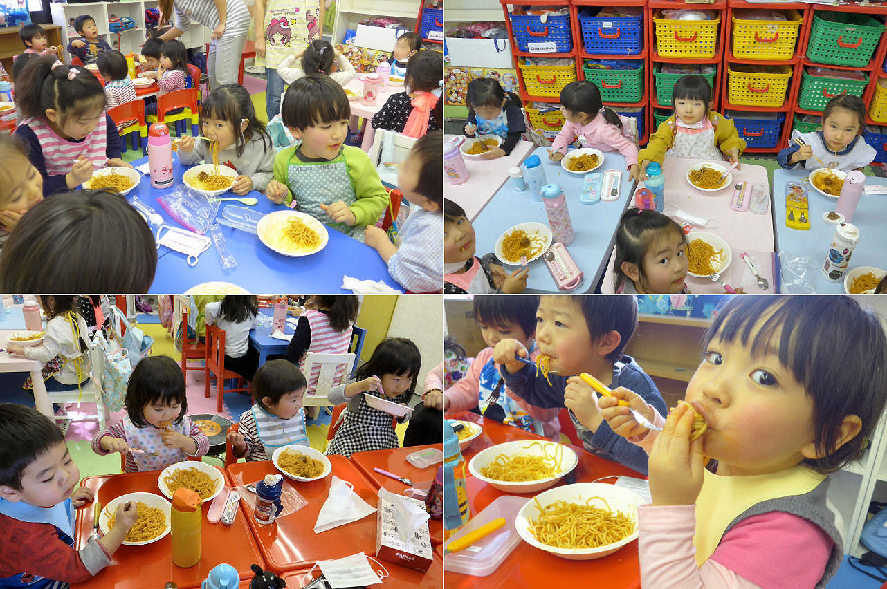 これ以上は制御が効かないということで、絵本は途中で切り上げて いただきます。普段は少食だったり、食べるのが遅いキッズも この日ばかりは物凄い早さで物凄い食欲を披露。お代わりが続出しました。いっぱい食べて大きくなぁれ。