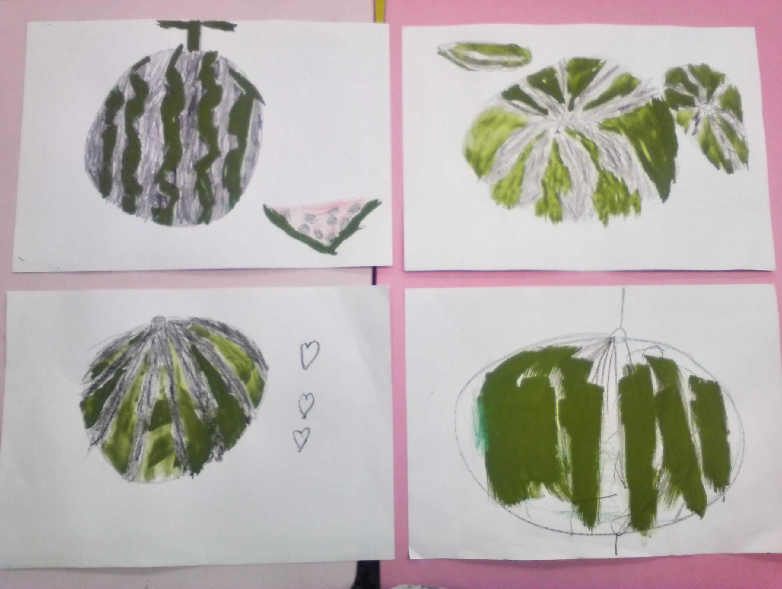 スジがついてるね。でも『ダイナマイト』『でんすけ』という種類のスイカは黒いラインが無いんだよ。『え~~~~~!』