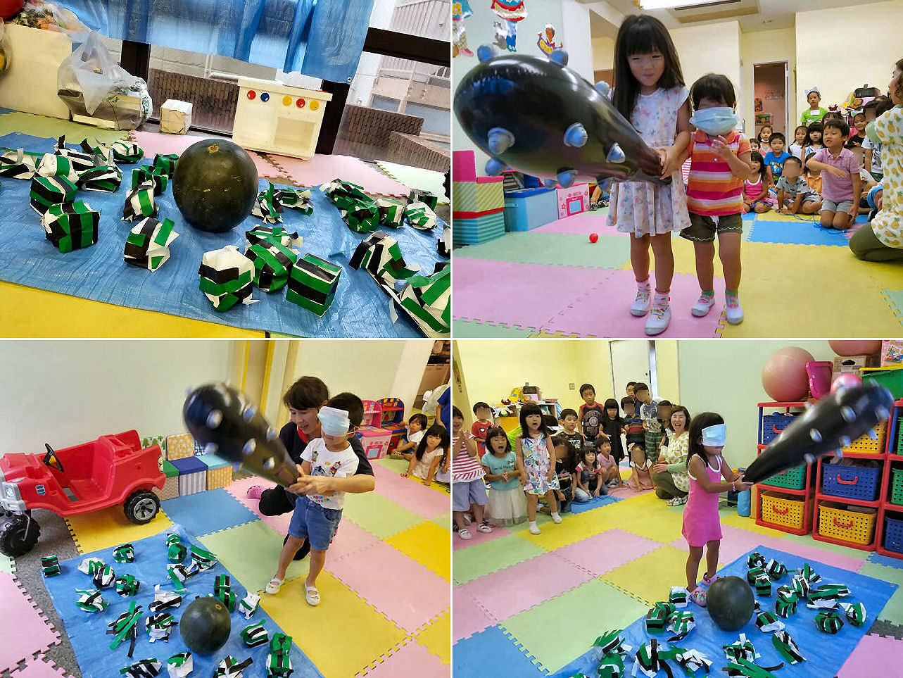 とは言っても木刀を使って本当に割ると現場が悲惨なことになったり、順番が回ってこないまま終了という展開になりかねず。ということで、毎年 思いっ切り叩いても大丈夫な凶器を使っていますが、今年は金棒(ビニール製です)。