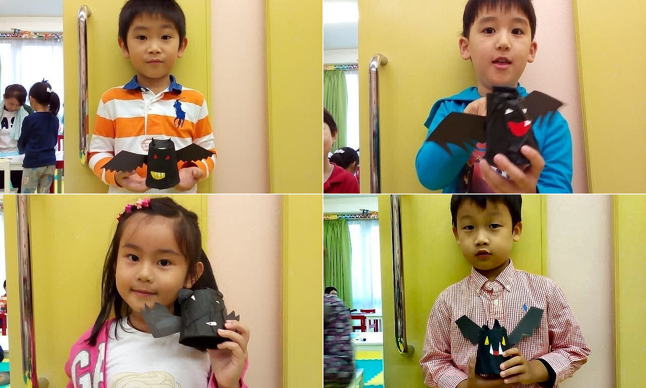 10月に入ってからは連日のようにハロウィーン用の工作実習を行っています。当然、その間も使う言語は英語のみ。色鉛筆・のり・ハサミ・・・こういった単語が英語なのは勿論、作り方の説明も、それに対する質問も全部英語です。