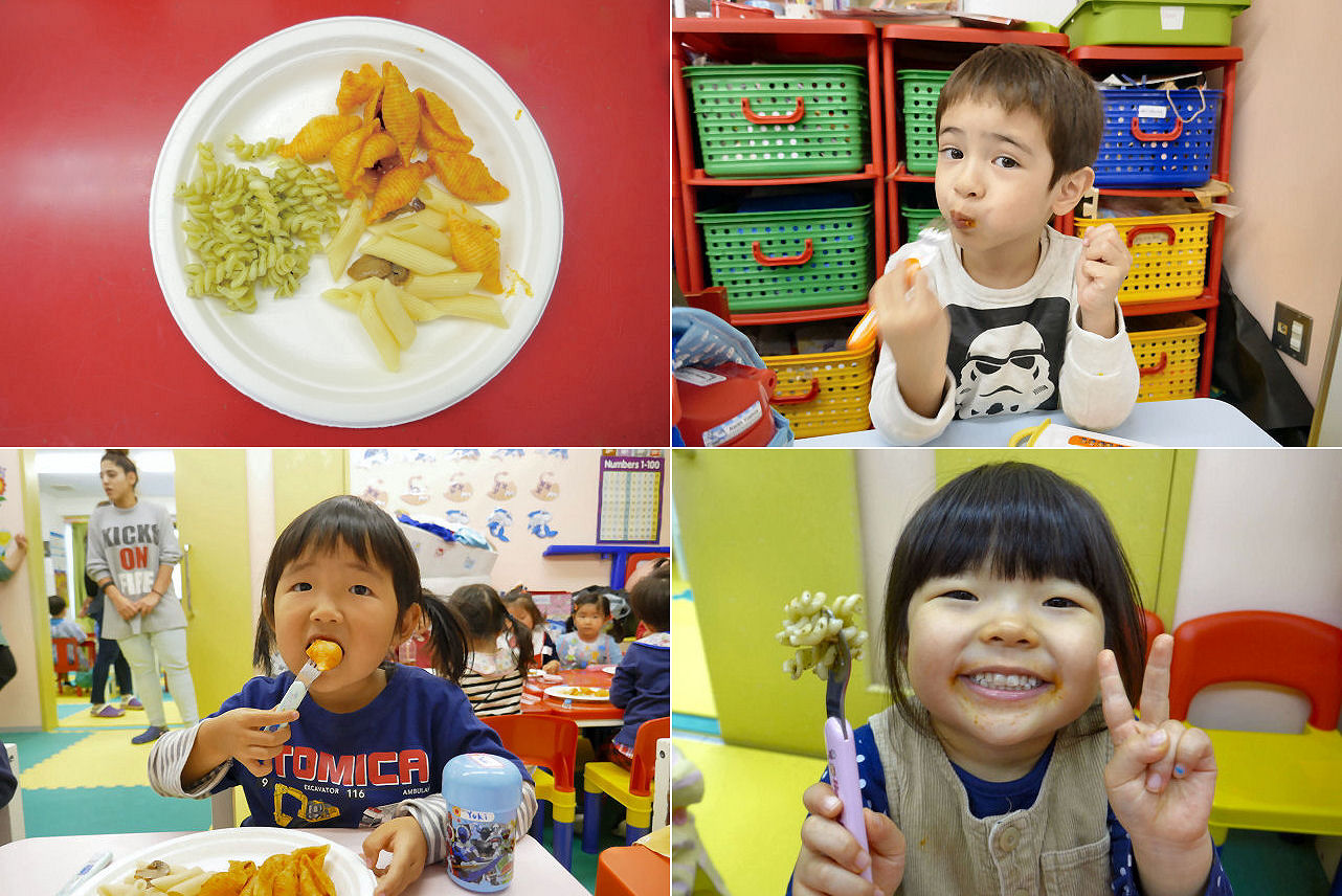 いよいよランチパーティーの時間。今回の献立は3種類のパスタ。担当するのは学生時代にイタリア料理店でアルバイト経験のあるスタッフ。味付けが3種類なのは勿論、パスタその物も3種類使っています。いずれも一口大の大きさなので、細長いスパゲティーと比較すると流血事件(?)が起きにくいのが利点。また、夫々の形を楽しむキッズもいたり。