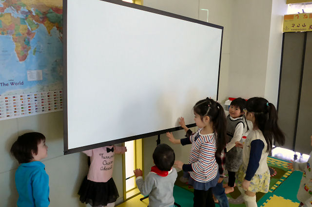 パソコンとプロジェクターを使った、普段と違う雰囲気にキッズはドキドキ。
