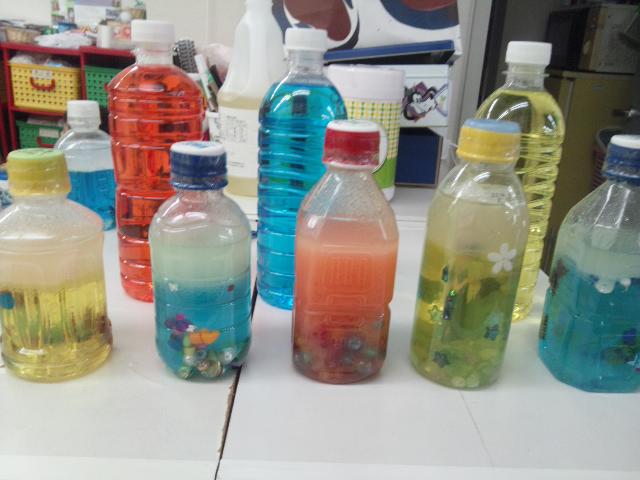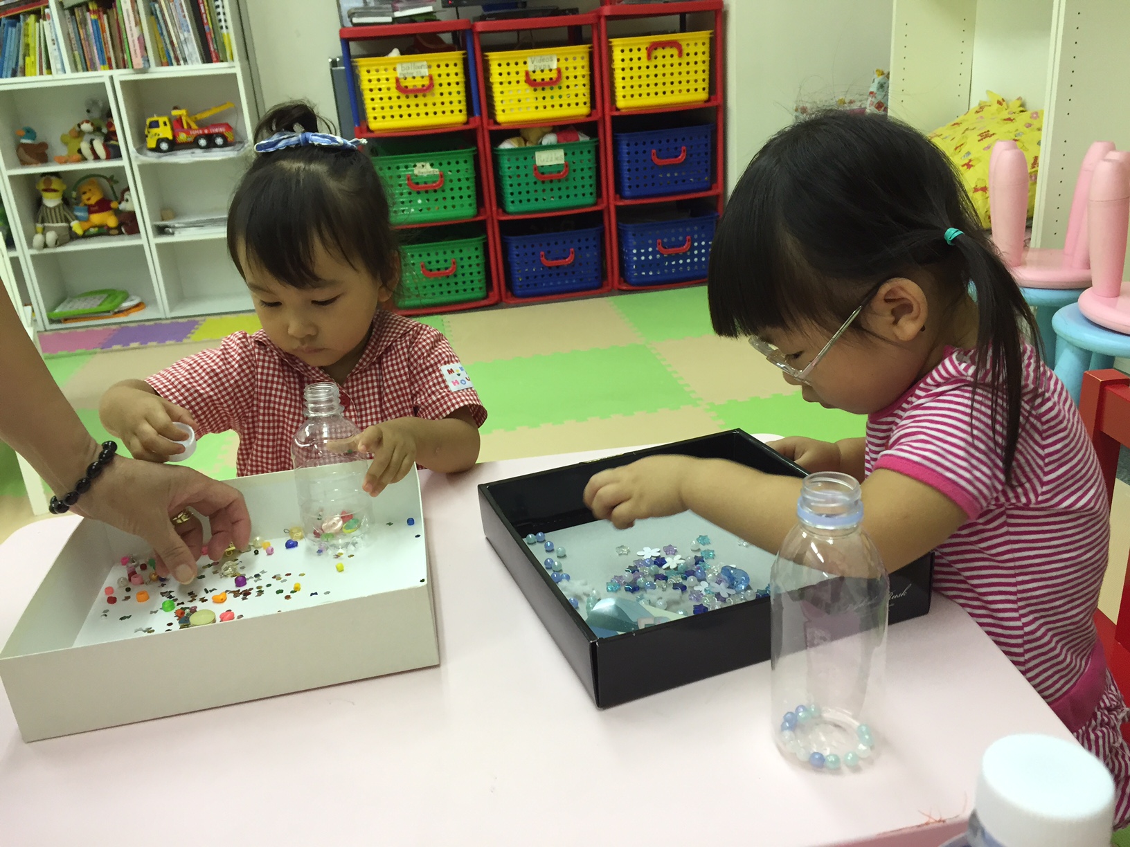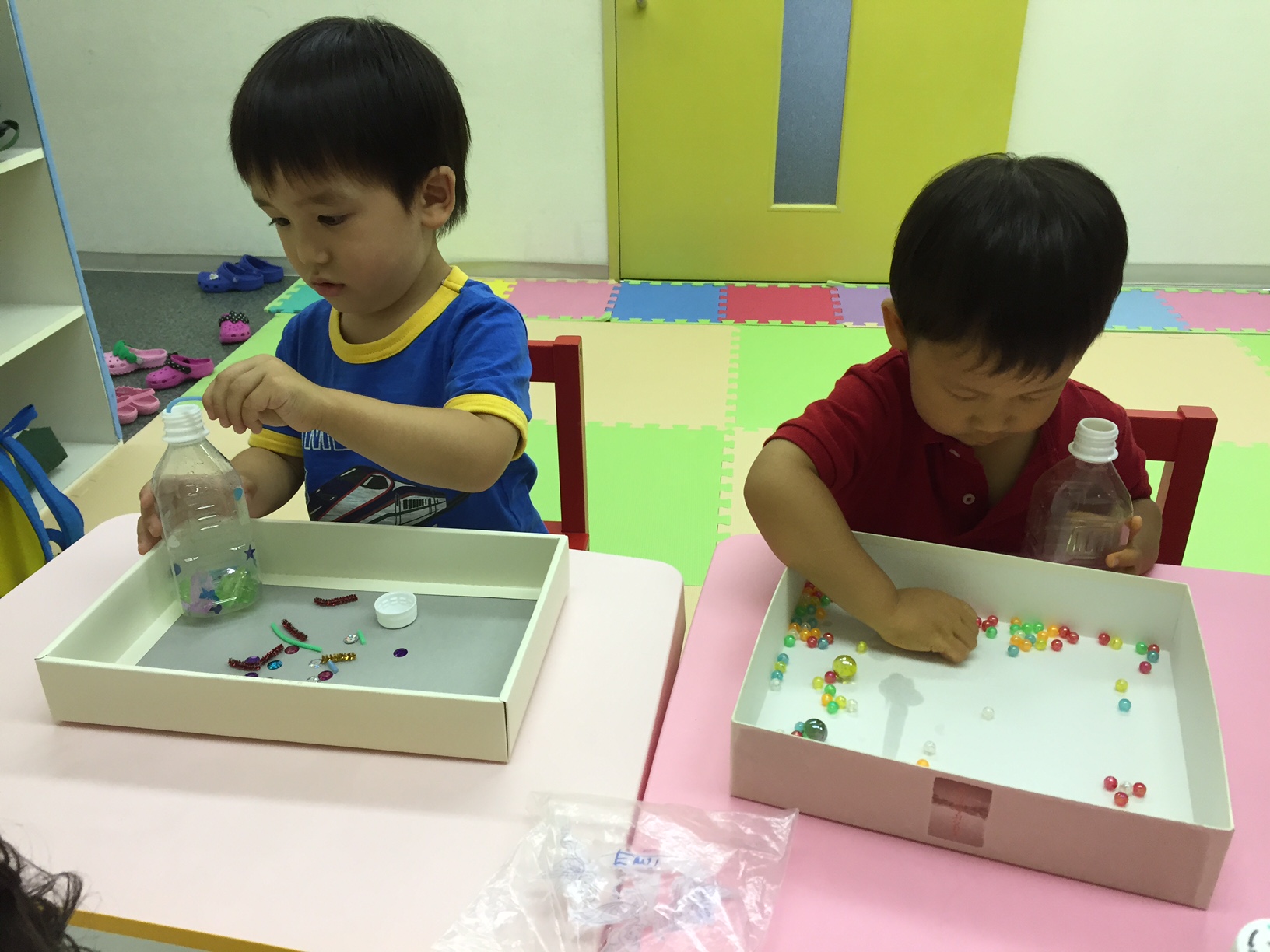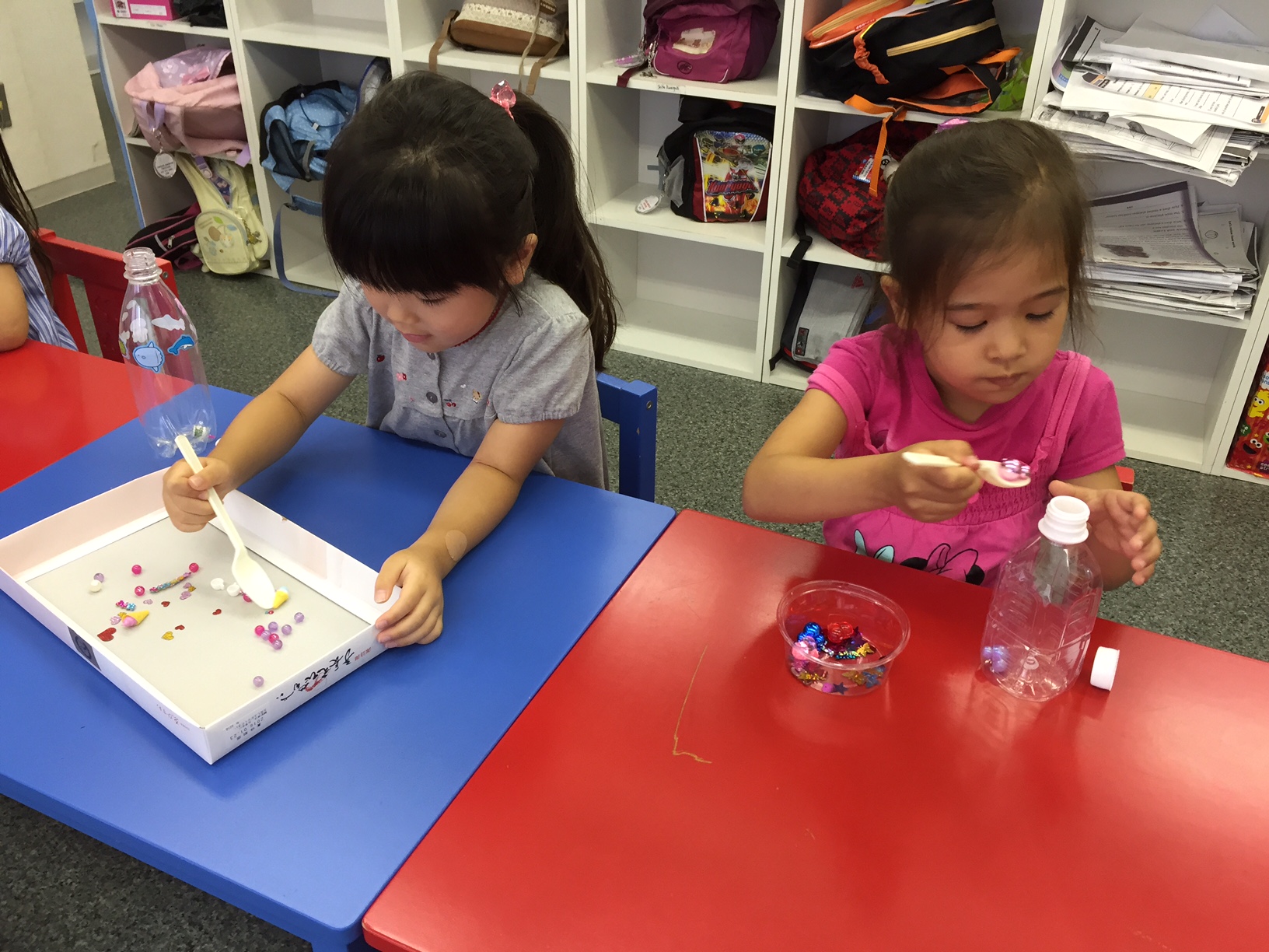 小さい子たちは指を上手に使い飾りを一生懸命ボトルに入れました。