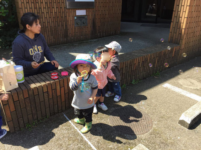 今日の外遊びはシャボン玉。シャボン玉自体は薄い2層に分かれており、夫々が別の波長の太陽光を反射し、それが混ざり合って・・・いや、難しいことは さておき、ともかく太陽光に照らされたシャボン玉が七色に光ります。本格的な春の到来を感じる瞬間でした。