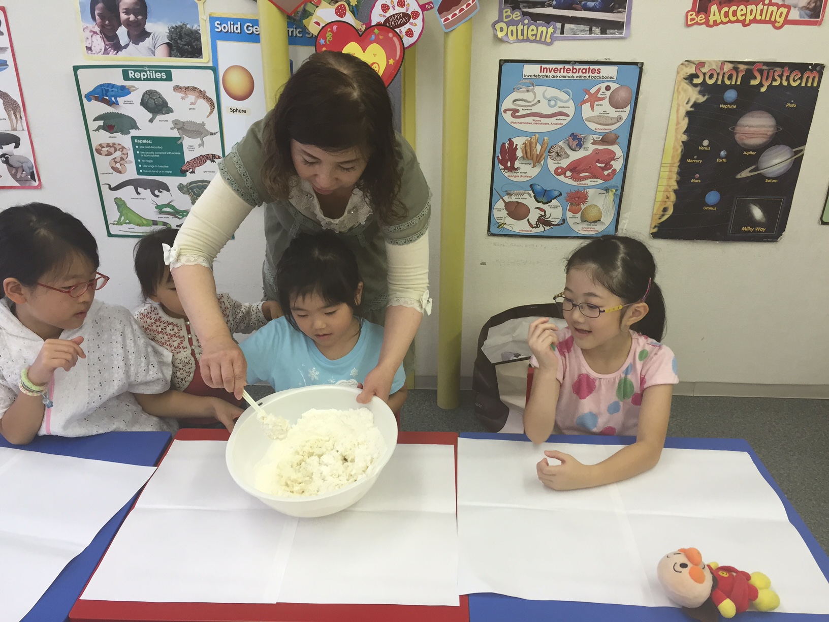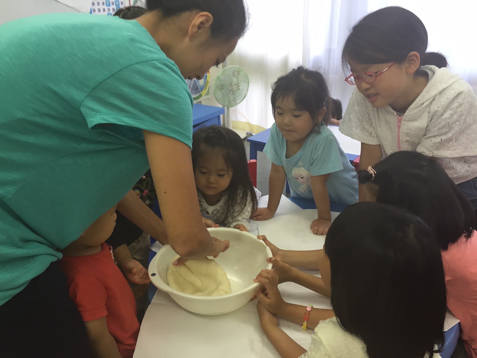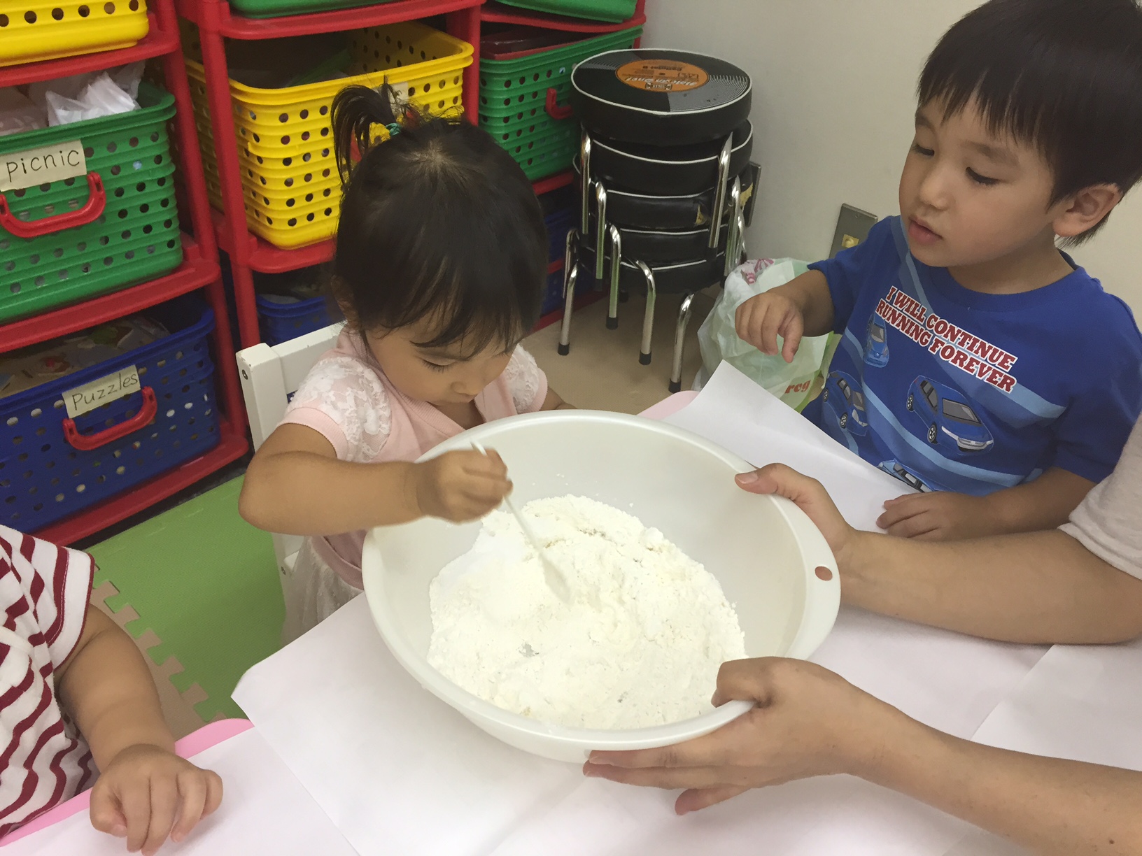 小麦粉を入れて『おー!!』、食用油を入れて『おーー!!』、塩を入れて『おーーー!!』。