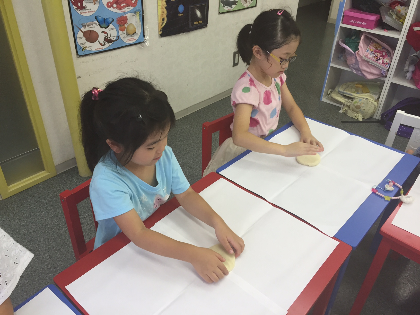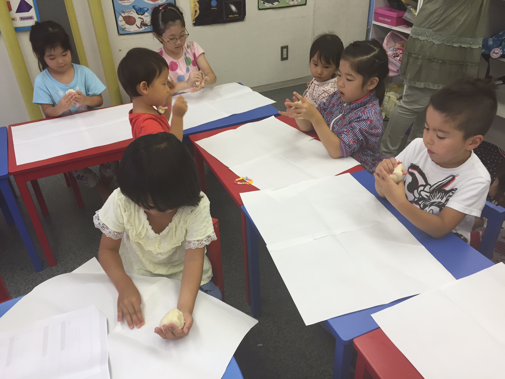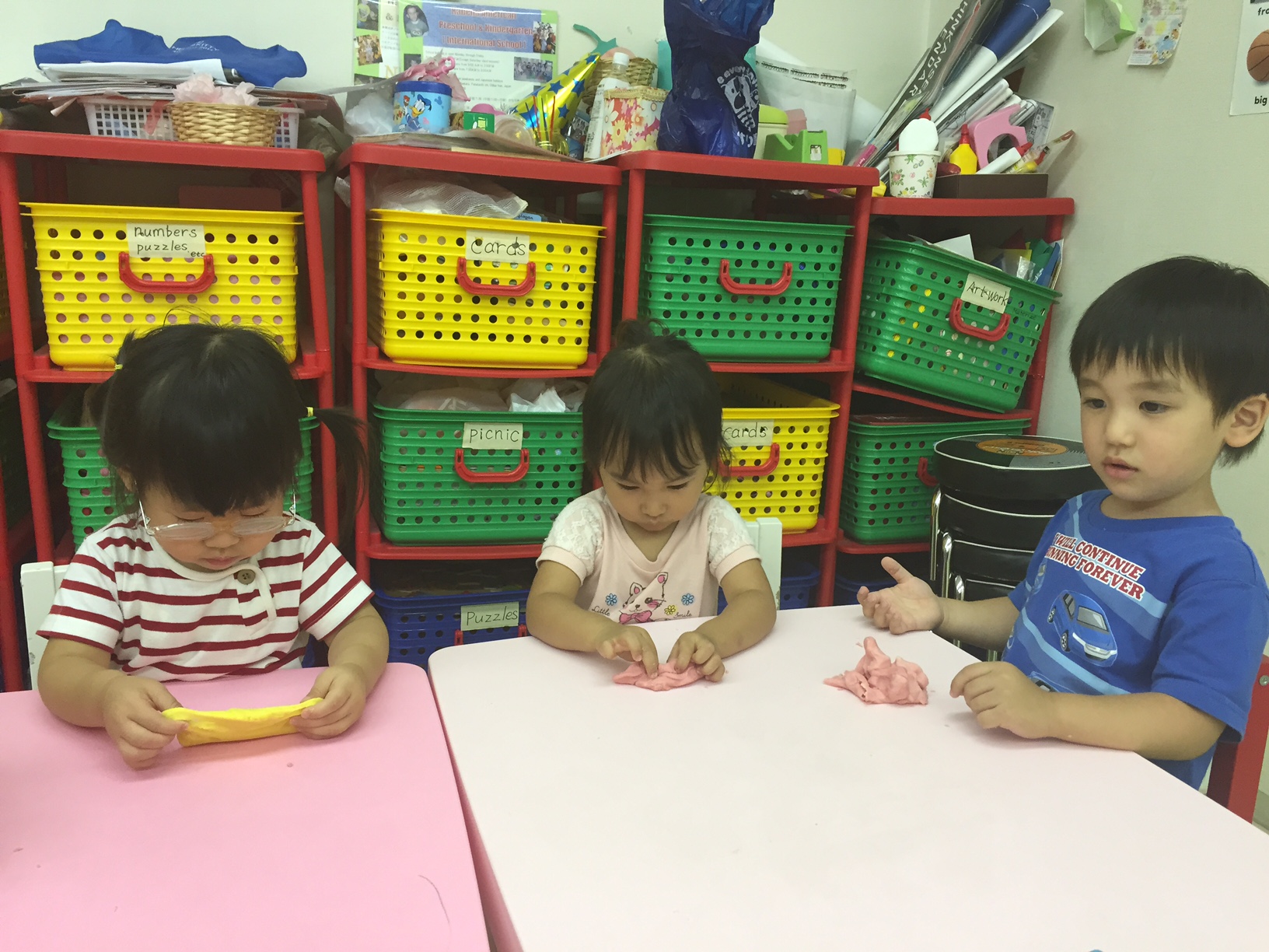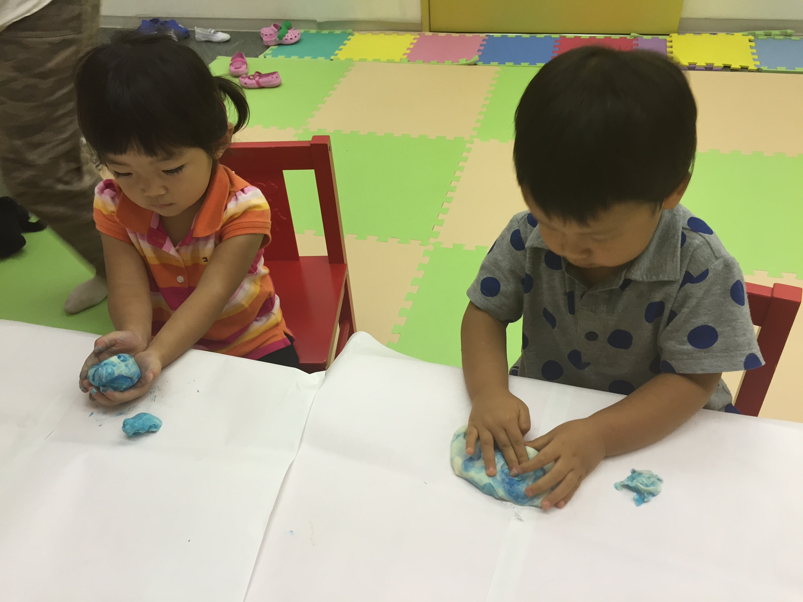 手に食紅がついてしまって嫌がる子供、白い粘土がだんだんと色がついてくる様子に大感激する子供。いろいろな反応がありました。