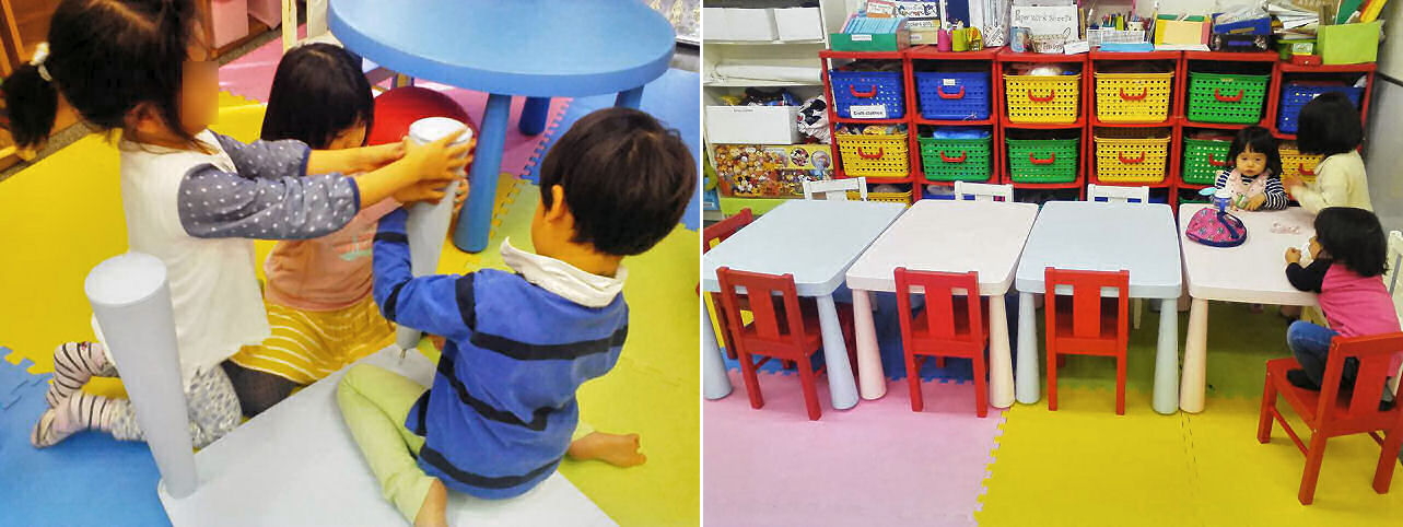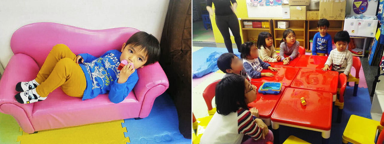 こちらはソファーの寝心地を確認しているところ。ぐっすり眠れそうかな? また、今回はベビークラス用の机と椅子も新調しましたが・・・試運転しているのは年上組の面々。こちらも気に入ってもらえたようです。