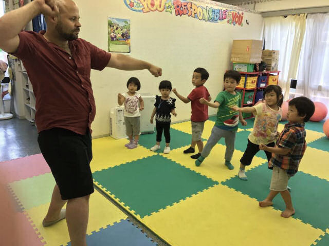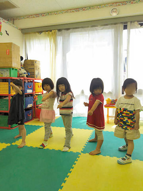 この日 担当のスタッフは音楽と空手が得意。ということでギターを演奏しながら みんなで歌を歌ったり、空手にも挑戦。