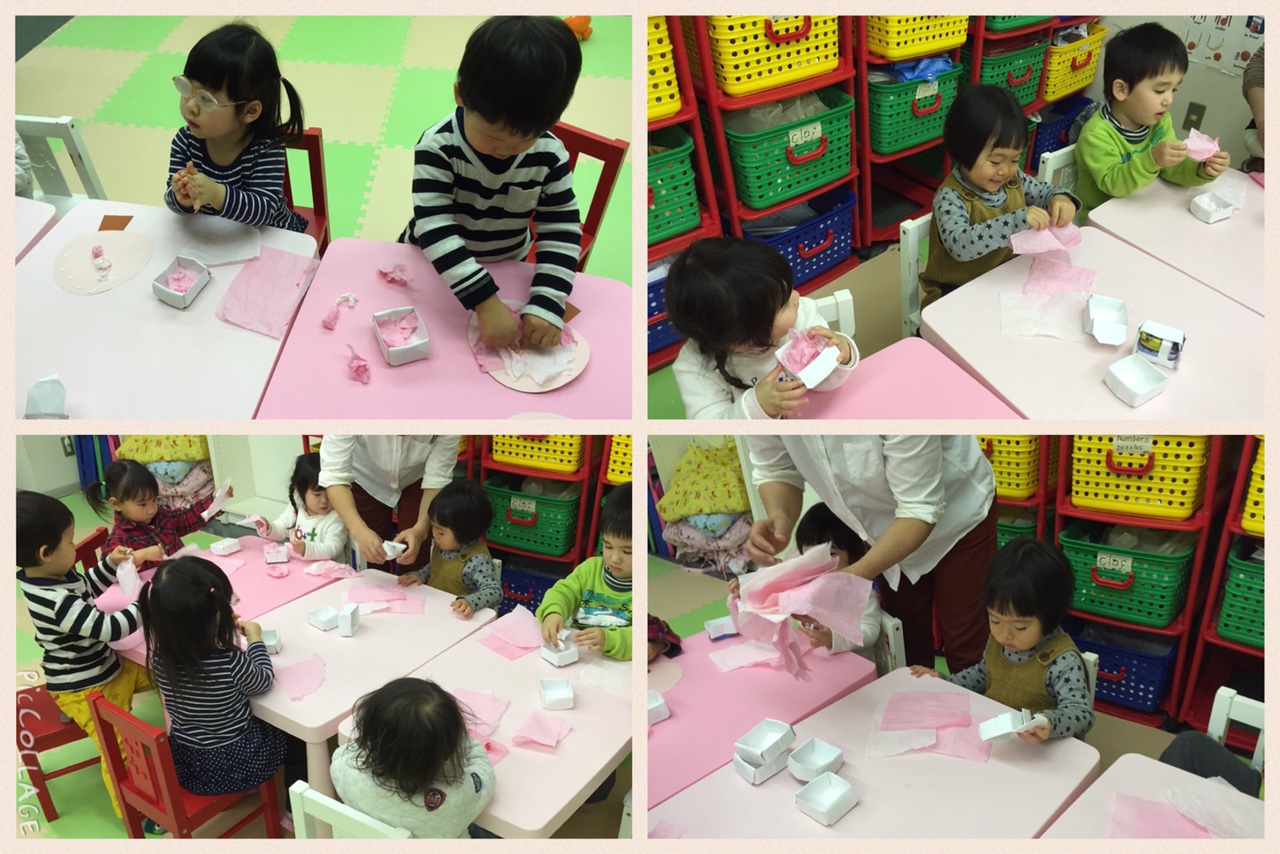 土台の木に綺麗なピンク色の紙を、上手にちぎって貼って。