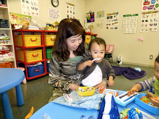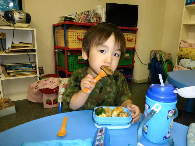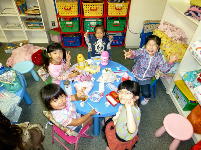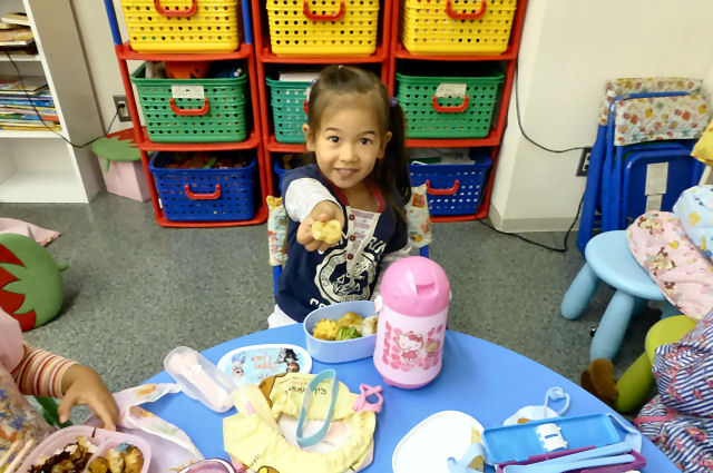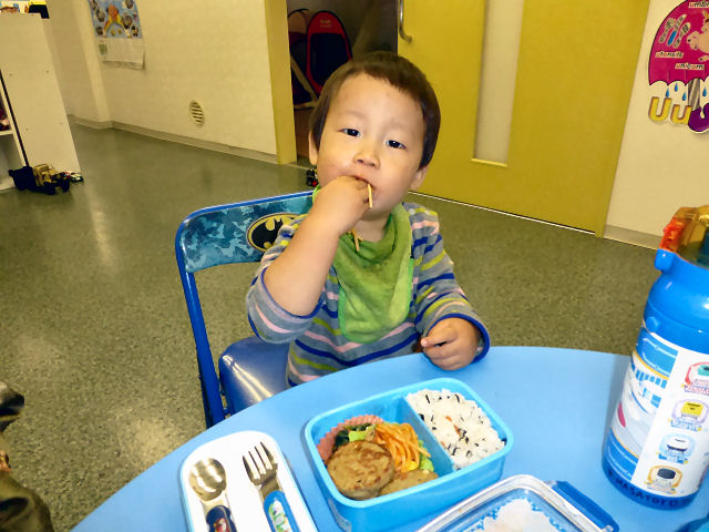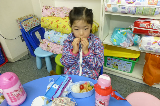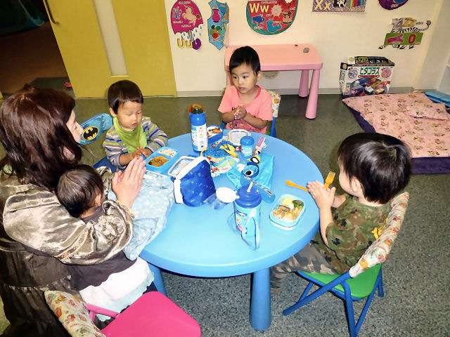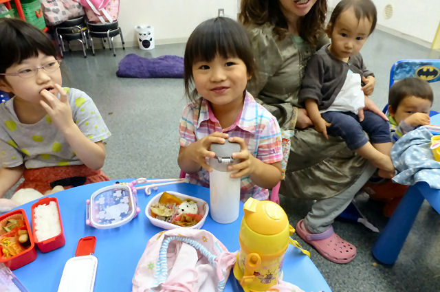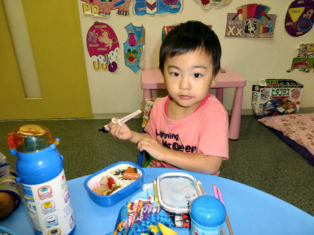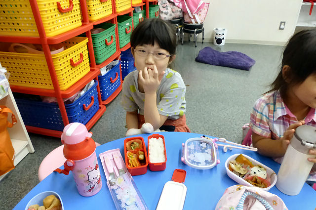 お昼ご飯の時間。現在、キッズは全員が お弁当を持参。親が作ってくれた お弁当を食べる時間はキッズにとって楽しみの1つです。(当スクールに給食は ありませんが、忙しい親御さんのため、業者による子供用のお弁当を手配することも可能です。)