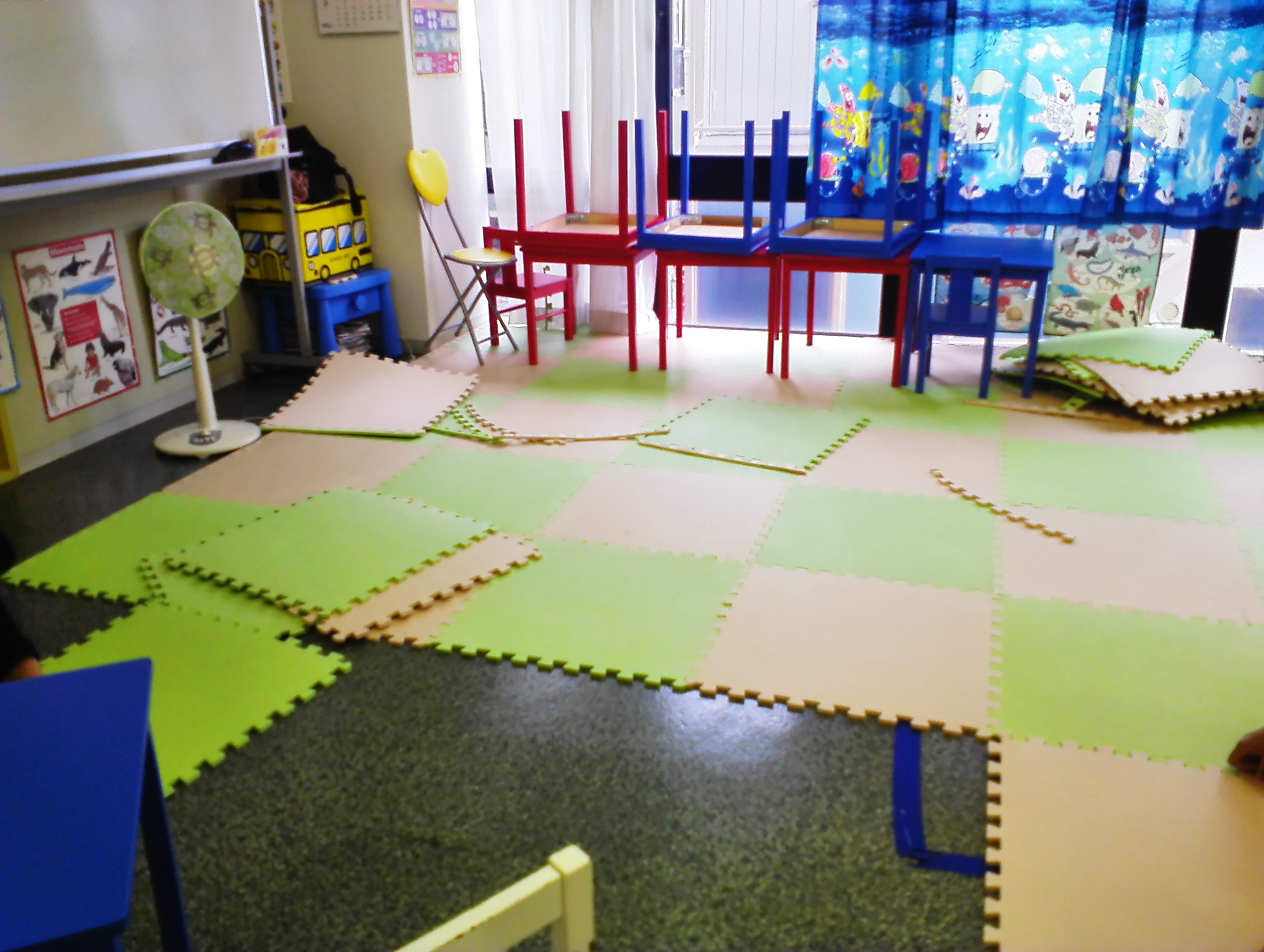 と、見つかってしまい、マットを重ねて滑り台にするキッズや率先して模様替えに参加するキッズ!