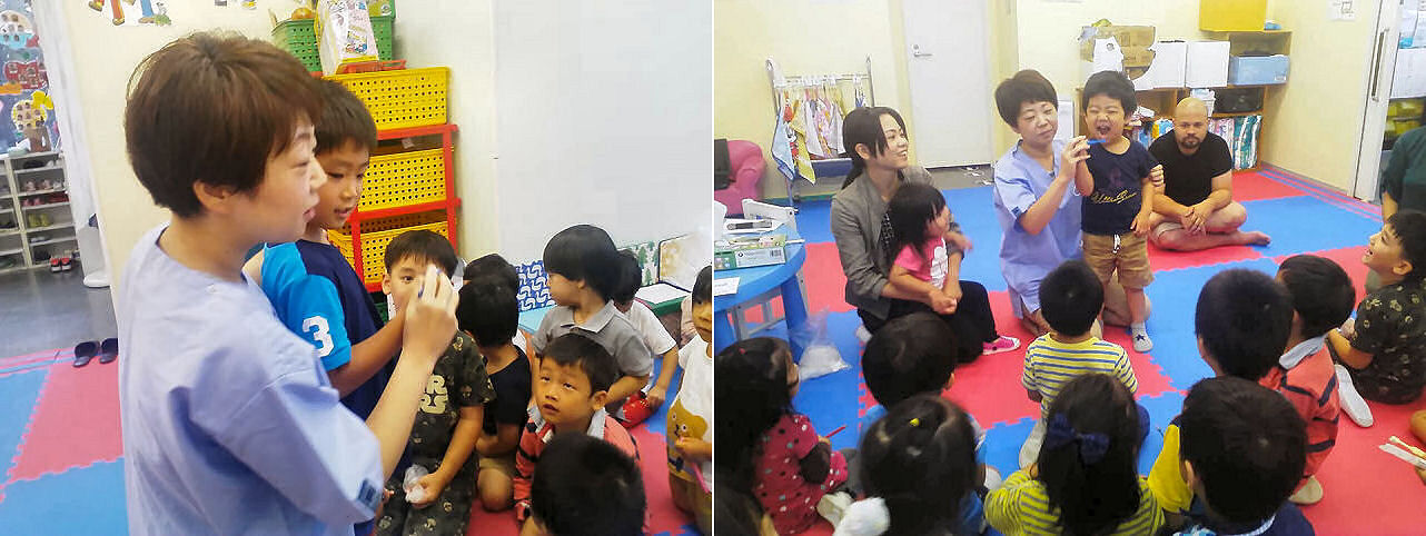 折角の機会なので、歯科医ママによる歯磨きレッスンも 行いました。こちらはキッズ全員で実施。ちゃんと磨けているかな?