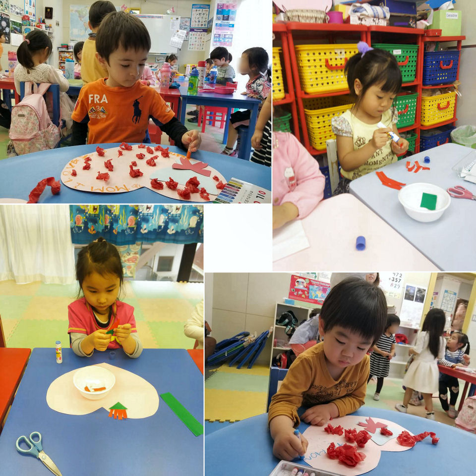 もうすぐ母の日。今日の工作実習では日頃の感謝の気持ちを込めて、みんなでプレゼントを作りました。大好きな お母さんのためということで、キッズの表情は真剣その物ですね。