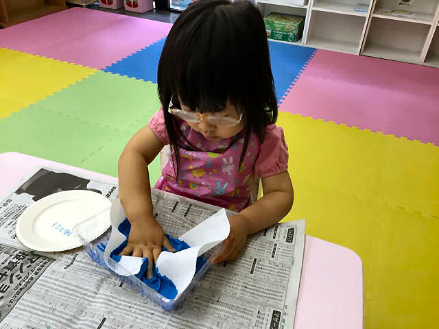 まずは色作りから始めます。青・桃色・紫・・・キッズが思い思いに紫陽花の色を再現します。続いて その色を紙に染み込ませます。