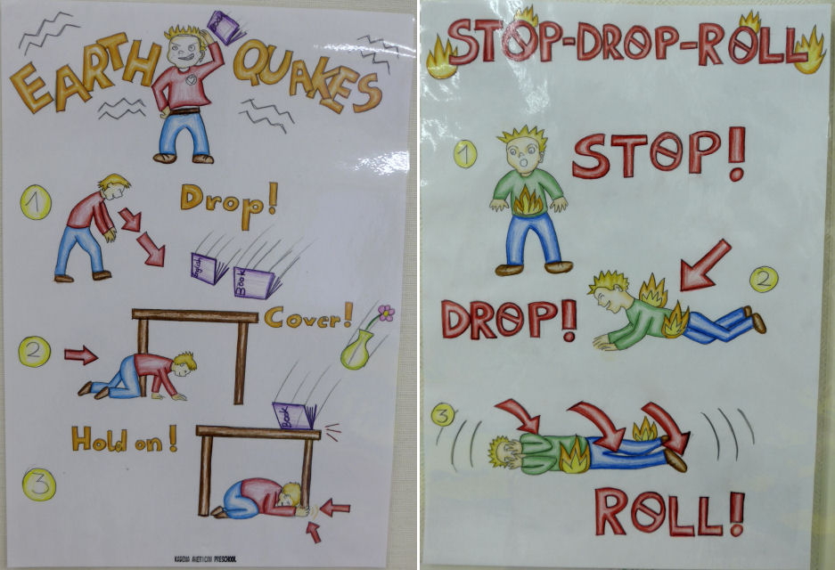続いての市からの指導は地震や火事発生時の対応内容/方法を常に教室内に掲示する必要がある、というもの。通常、この手の掲示物はインターネット上で素材を見付けるのですが、今回は どうも直球ど真ん中と呼べる素材が見つからず。