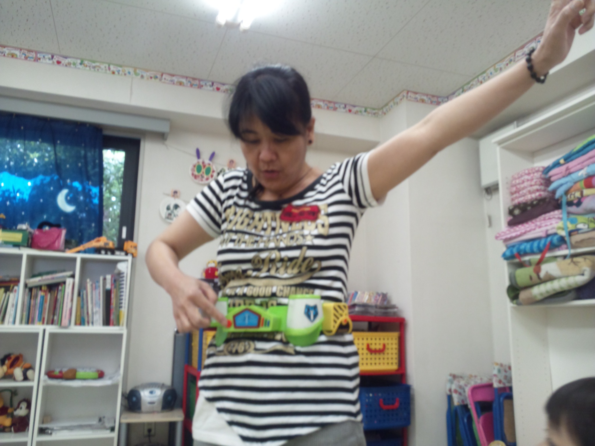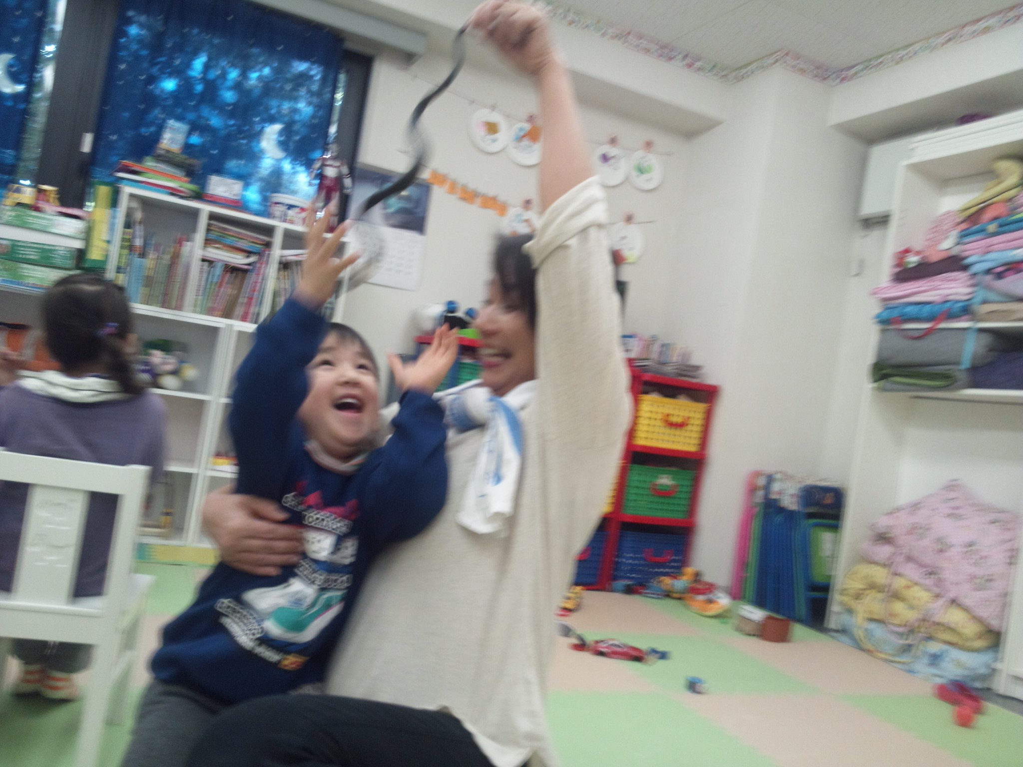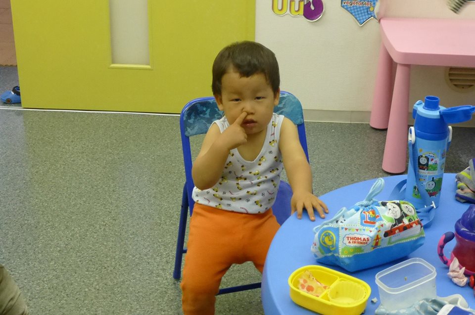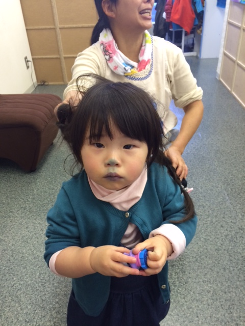 そして、 入園したばかりですが、この子は、何故かバイ菌マンのスタンプを自分の顔にペタペタ