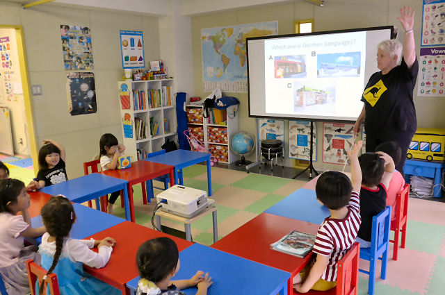今日の特別授業は そのスタッフ出身地であるオーストリアに関わるクイズ。その第2弾ということになりますが、パソコンとプロジェクターを使い、普段とは違う雰囲気の中で面白おかしくオーストリアを紹介してくれます。キッズの反応は・・・凄いですね。大いに集中して授業に参加してくれるのは結構なことですが、物凄い叫びっぷりでクイズに回答していました。