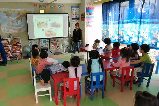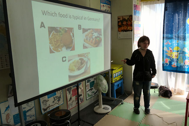 折角の機会なので、彼女による異国の文化学習:ドイツ編を実施。彼女が一方的に話しているだけではキッズが退屈しそうなので、ここは発想の転換でクイズ形式に。パソコンとプロジェクターを用い、面白おかしく演出された内容に現場は物凄い盛り上がりようでした。