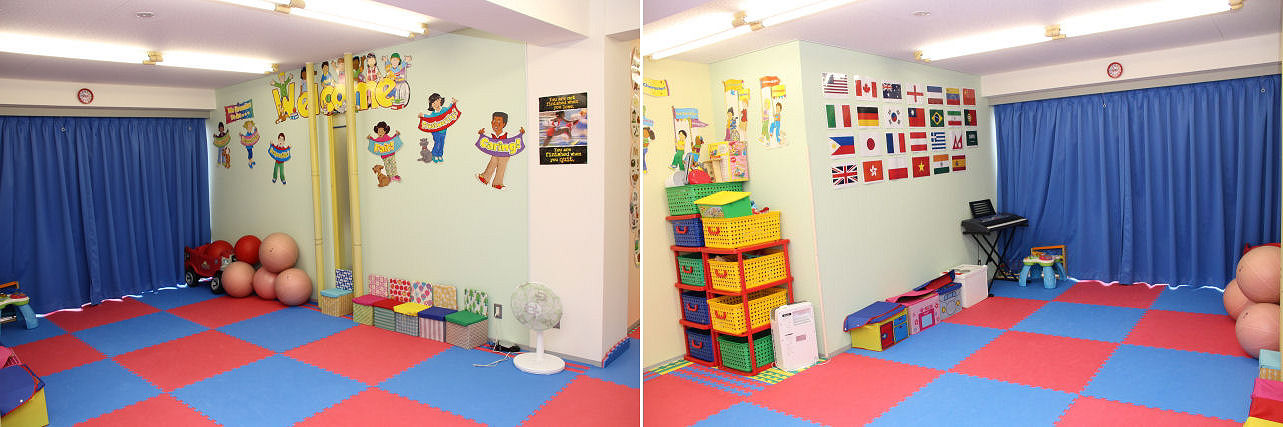 続いてはプレイルーム。この部屋のみ、青を中心とした配色になっています。壁やカーテンが防火仕様になったり、マットは従来よりも厚みのある物になったり。また、壁には当スクールに縁のある国の国旗が貼られています。