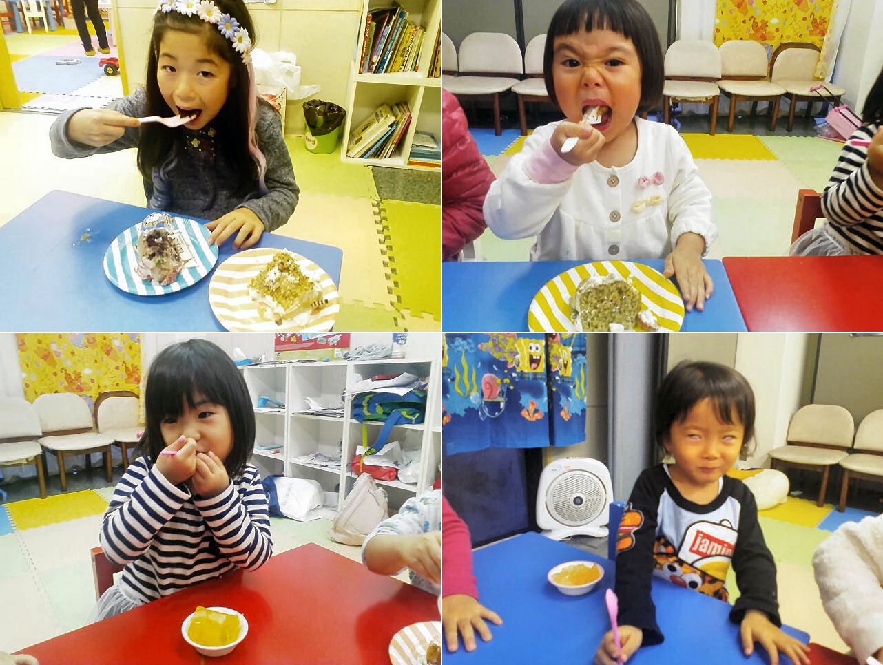 ハッピーバースデー斉唱の後はケーキを山分け。みんなが食べるのに夢中になっている間は妖精が通り過ぎたかのような静寂が訪れます。