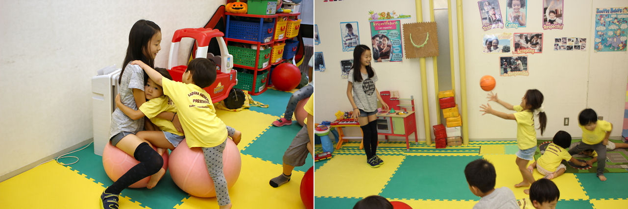 また、この時間帯は夜までフルデイクラス、というキッズも滞在しています。そのため、幼いキッズ達の面倒を見たり、一緒に遊んだりして良きお兄ちゃん・お姉ちゃんぶりを発揮する機会にもなります。黄色いTシャツを着ているのがフルデイクラスのキッズです。(この日、フルデイクラスは遠足が あったため、たまたまスクールTシャツを着ていますが、普段は私服で登園します)