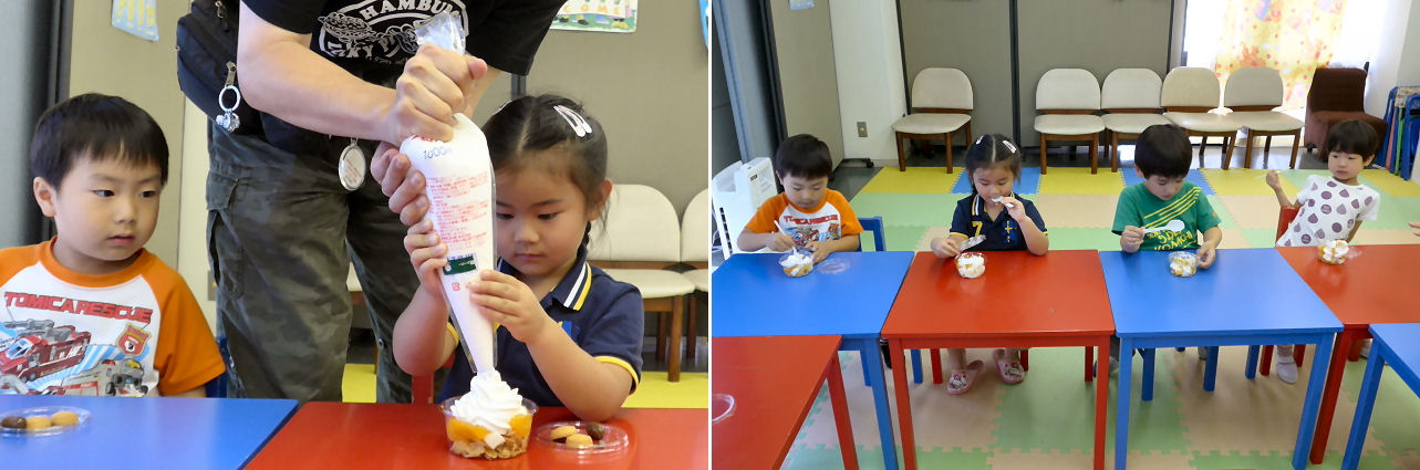 フルデイクラスでは今月中旬に夏祭りを実施したり、昨日はスタッフのお母様が育てたスイカの差し入れが あったり。ですがサタデークラスも負けてはいません。今日は夏休み最後の思い出にということで、昼食後のデザートに かき氷が振る舞われました。