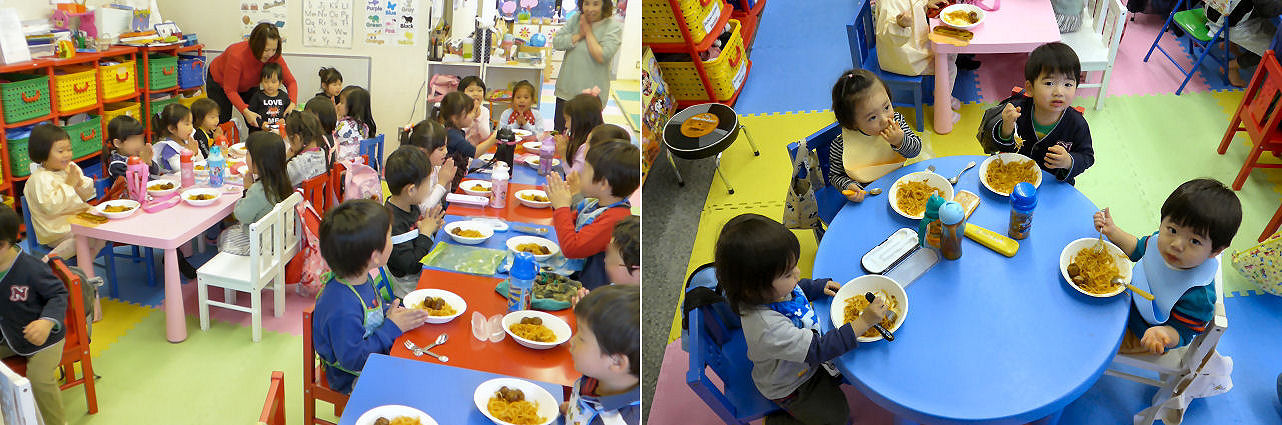 今日は単発・複合を含めて今年度5回目の、そして今年度最後のランチパーティー開催です。今回の献立は映画「わんわん物語」に登場した、スパゲティーのミートボール乗せ。調理担当は学生時代に伊太利亜料理店でアルバイト経験のあるスタッフ。より沢山食べてもらおうということで、午前中は わんわん物語の絵本を朗読。例のスパゲティーが出てくる場面でスタッフが「美味しそう~。食べてみたいわねぇ~」と、キッズを上手く(白々しく?)煽ります。